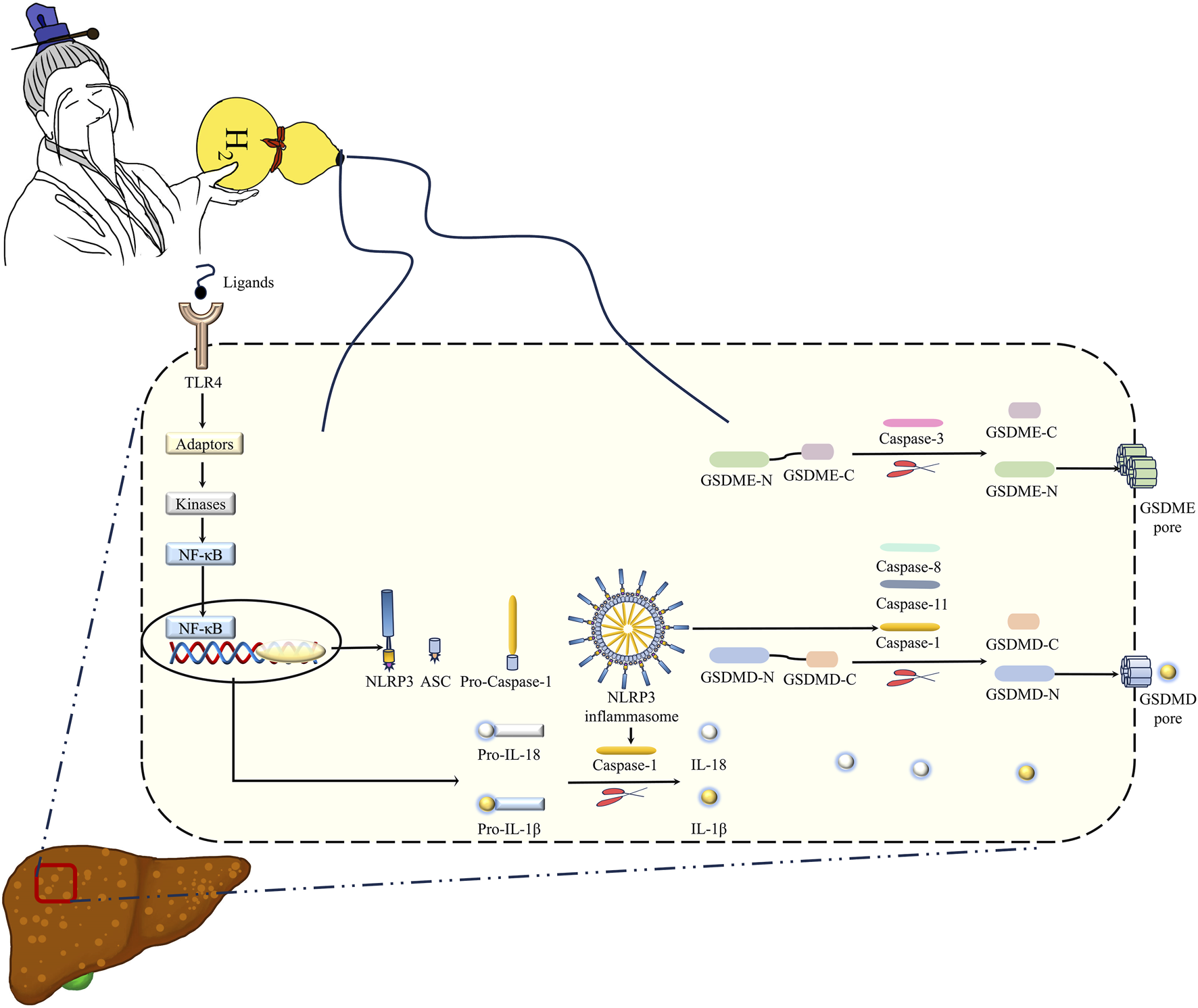 Figure 10. Hydrogen gas (H2) is the immortal energy that subdues demons and monsters. H2 is like the immortal qi in the treasure gourd of the immortal grandfather in Chinese mythology, which can subdue demons and eliminate evil spirits. Intraperitoneal injection of H2, as a novel method for H2 delivery, can alleviate MCD diet-induced MASLD in mice via inhibiting hepatic oxidative stress, TLR4-mediated innate immune signaling, and GSDMD- and GSDME-mediated pyroptosis. Therefore, H2 therapy may act as a novel therapeutic strategy for MASLD in animals, which is worth further investigation.