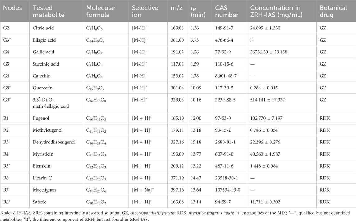 In China, the prescription of Zhuriheng drip pill (ZRH) originated from a Mongolian clinical formula for the treatment of cardiovascular diseases. The herbal medicine composition of ZRH includes Fructus Choerospondiatis (seed) (emperor, GuangZao, GZ), Myristica fragrans Houtt.(seed) (minister, RouDoukou, RDK), Lignum AquilariaeResinatum (ChenXiang, CX), Amomum Tsao-ko (CaoGuo, CG), asafetida (AWei, AW), Carthamus tinctorius L. (HongHua, HH), Gardenia jasminoides Ellis (ZhiZi, ZZ), synthetic borneol (BingPian, BP), and Bovis Calculus Artifactus (Artificial NiuHuang, NH) (Wang et al., 2018). In our previous studies, we used rapid high-performance liquid chromatography-tandem quadrupole-electrostatic field orbitrap high-resolution mass spectrometry (HPLC-Q-Exactive-MS/MS) to identify 60 metabolites in ZRH, which were speculated in positive and negative ion modes (Zhang et al., 2024); 15 inherent metabolites were quantitatively analyzed (Bu et al., 2023). The network pharmacology, molecular docking, and spectrum-effect study of ZRH found that PPARs are the co-target of multiple metabolites which inhibit macrophage foaming by regulating the PPAR pathway (Zhai et al., 2024; Mu et al., 2019). However, despite ZRH efficacy in treating CHD, the molecular mechanisms and candidate Q-markers of ZRH towards CHD remain unclear.