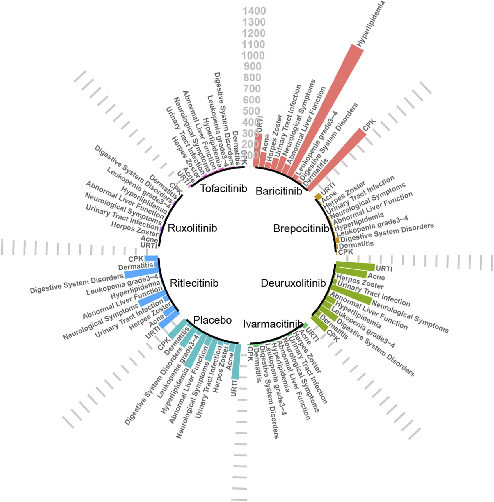 Absolute incidence of adverse reactions caused by JAK inhibitors (per 10,000 people).