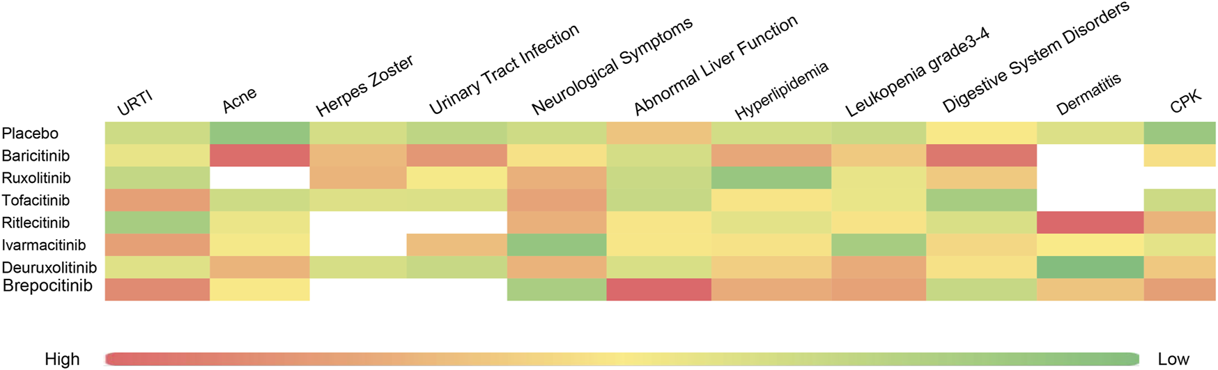 A total of 12 RCTs (Paracha et al., 2024; King et al., 2024; King et al., 2023; King et al., 2021a; Almutairi et al., 2019; King et al., 2022a; King et al., 2021b; Anderson et al., 2024; Zhou et al., 2023; King et al., 2022b; ClinicalTrials.gov, 2023) involving 3,840 patients were included in the analyses, encompassing seven interventions. The NMA’s PSRF score of 1 demonstrated that convergence was adequate. The results of the network meta-analysis were consistent with the assumptions of homogeneity and consistency, as confirmed by the node-splitting inconsistency test (Supplementary Figures S4, S5). Brepocitinib (RR [95% CrI] = 1.16 [1.02, 2.90]) indicated a marked disparity in comparison to the control group (Figure 5). Additionally, brepocitinib was found to be significantly more likely than ritlecitinib (RR [95% CrI] = 1.98 [1.16, 3.37]) to cause upper respiratory tract infections, as reflected in the league table (Supplementary Table S3). The SUCRA values (Supplementary Figure S6) unveiled similar patterns identified in the forest plot (Figure 3) and the league table (Supplementary Table S3): brepocitinib (22.00%), tofacitinib (28.44%), ivarmacitinib (28.92%), baricitinib (54.98%), deuruxolitinib (57.83%), placebo (63.55%), ruxolitinib (67.61%), ritlecitinib (76.67%).