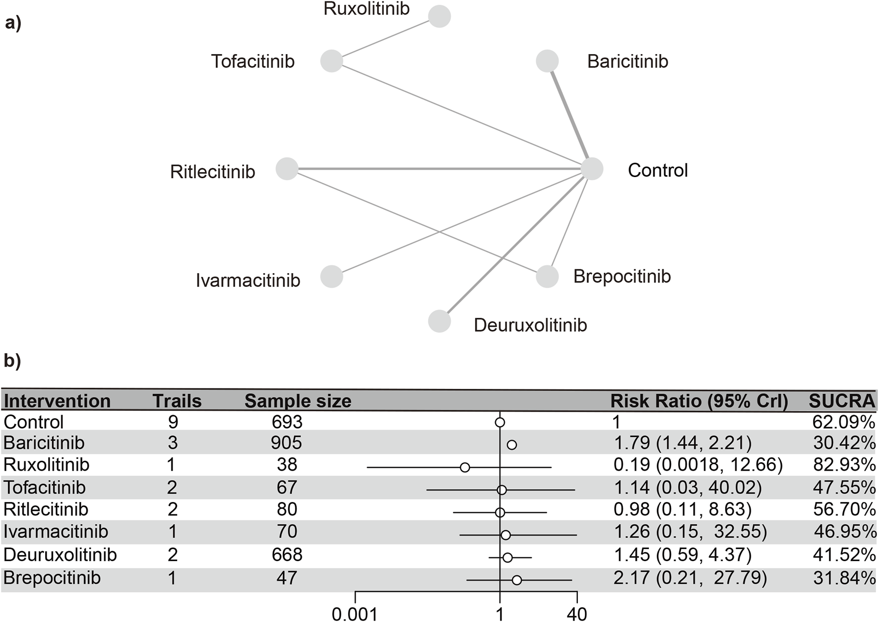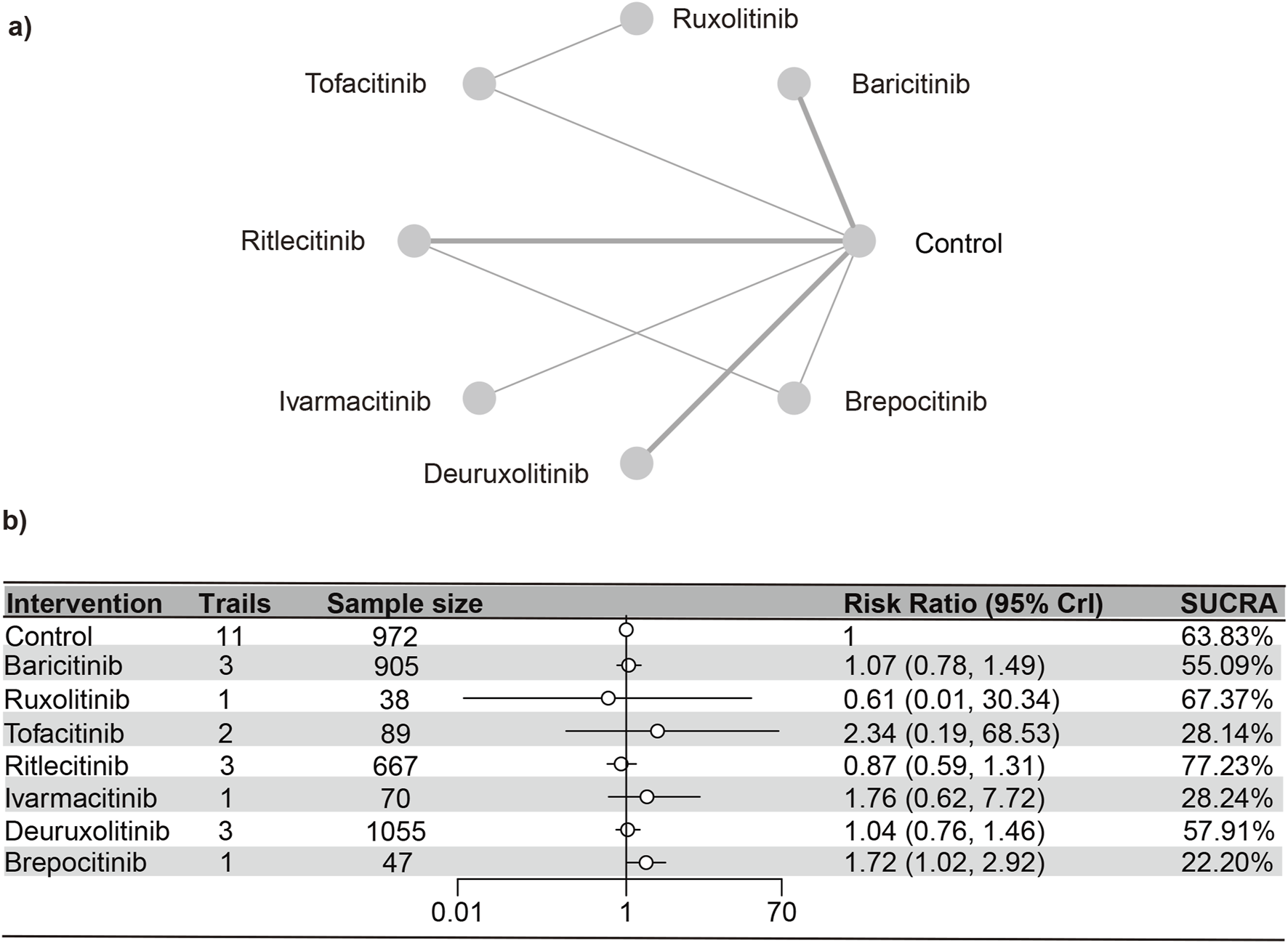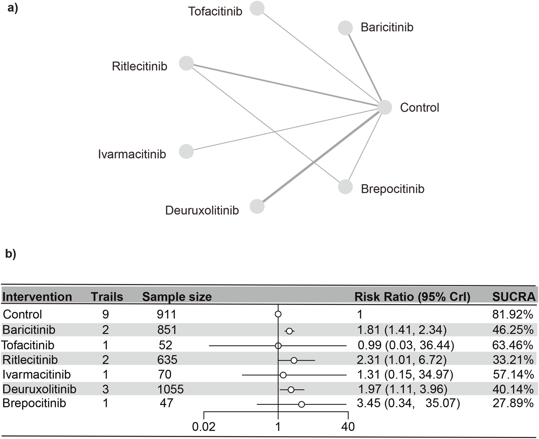 The SUCRA values (Supplementary Figure S26) demonstrated a pattern that aligned with the findings presented in the forest plot (Figure 9) and the league table (Supplementary Table S11): brepocitinib (27.89%), ritlecitinib (33.21%), deuruxolitinib (40.14%), baricitinib (46.25%), ivarmacitinib (57.14%), tofacitinib (63.46%), placebo (81.92%).