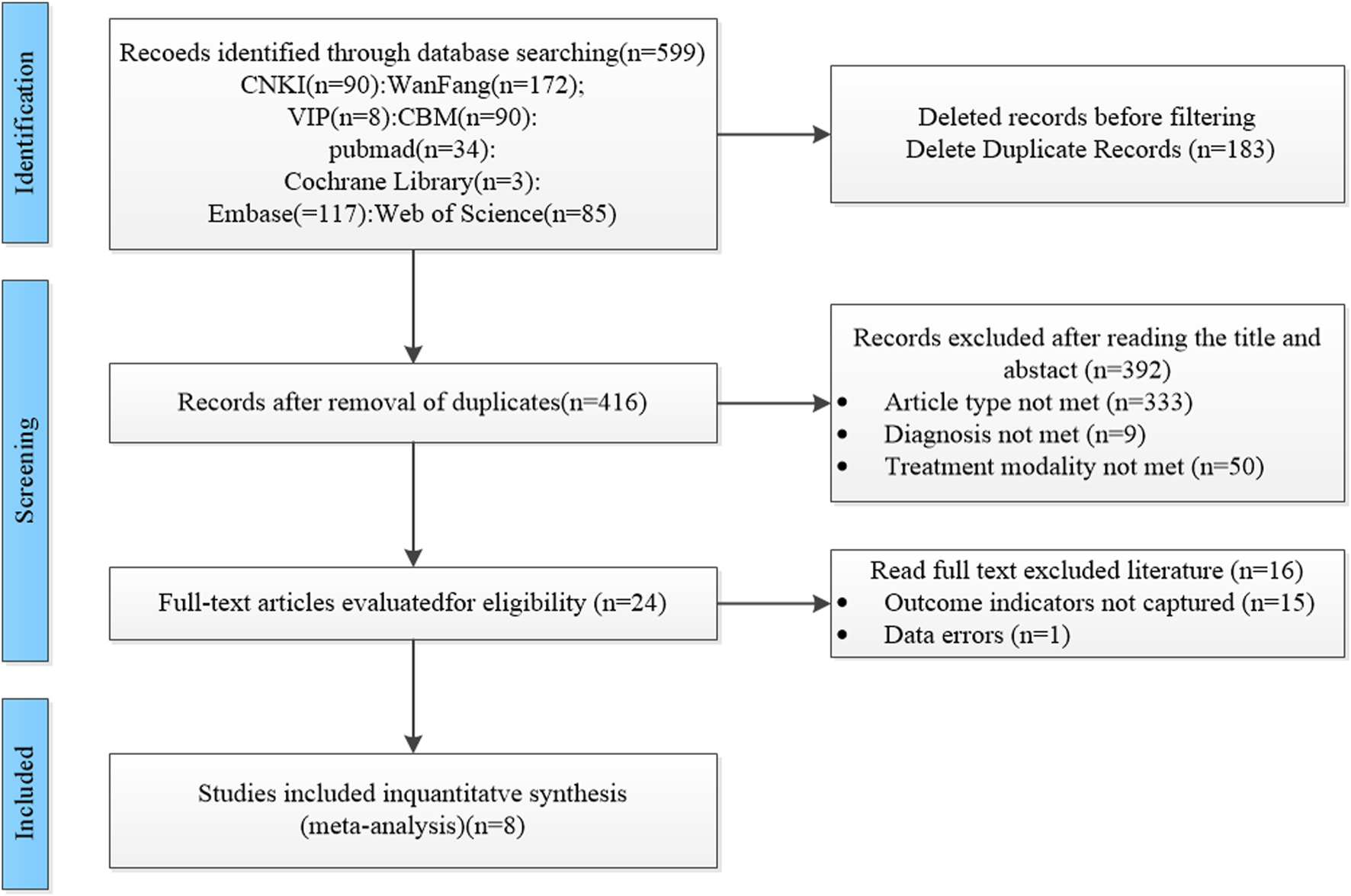 A total of 599 studies were included in this study, and we excluded 183 duplicate studies. Among the remaining 416 studies, 333 studies were excluded due to the type of study not being available, including the exclusion of reviews, animal experiments, and summaries of experience, 9 studies were excluded due to the type of treatment not being available, and 50 studies were excluded due to the type of treatment not being available. We excluded 16 papers after carefully reading the full text, 15 papers without obtaining the main outcome indicators, and 1 paper with unreasonable methods of testing. A total of 8 studies (Cai et al., 2023; Cai et al., 2022; Li et al., 2022; Qlan et al., 2023; Wang Y. et al., 2024; Wang S. et al., 2024; Wu et al., 2025; Zhu, 2023) were finally included, and the screening process is shown in Figure 1.