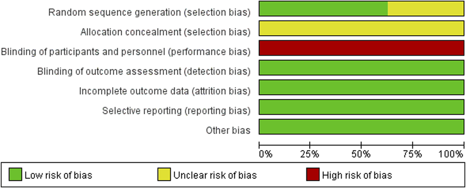 Of the 8 studies included in the literature, 4 studies used a random number table method and 1 study used a randomized bicolour method, and these 5 studies were categorized as being at low risk of bias; 3 studies reported randomization only, without specifying the details, and were categorized as being at unknown risk of bias. All studies lacked a description of allocation concealment, so the program was rated as “unknown risk of bias”; none of the studies reported blinding, and blinding of investigators and subjects was rated as “high risk of bias,” but all metrics were measured using specific instruments, so metric assessment may not be affected by the risk of bias. However, all indicators were measured using specific instruments, and therefore the assessment of the indicators may not have been affected by blinding, so blinding of the outcome indicators was rated as “low risk of bias”; The studies all reported complete data, incomplete outcome data and Selective reporting were rated as “low risk of bias”; the baseline level of data in this study was homogeneous, so other risks of bias were rated as “Low risk of bias.” About the results of the quality risk assessment, as shown in (Figure 2 and Figure 3).