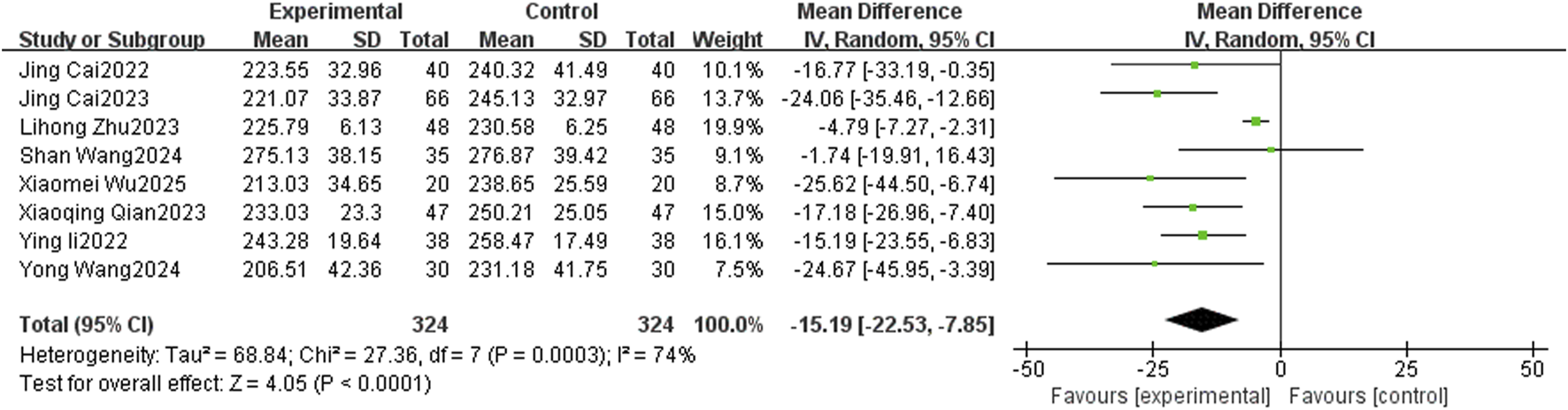A total of 8 studies reported the level of CAP, with a large heterogeneity among studies (I2 = 74%, P = 0.0003), and Meta-analysis was performed using a random-effects model. The overall study showed that TCM-preparation reduced CAP values in patients with MAFLD combined with T2DM (MD = −15.19, CI [−22.53, −7.85], P < 0.0001) (Figure 4). To explore the source of heterogeneity, we performed subgroup analyses of the intervention duration (8 w, 12 w) and the intervention in the treatment group (TCM-preparation, TCM-preparation+SBT), which suggested that the above reasons might not be the source of heterogeneity (Supplementary Figure S1). Due to the limited number of articles, we did not perform meta-regression. In order to assess the robustness of the results, we excluded articles one by one and analyzed the remaining articles by sensitivity analysis, and found that the heterogeneity was significantly reduced after excluding Lihong Zhu 2023 and the combined effect sizes did not change significantly, suggesting that the results were robust (Table 3). Despite the high heterogeneity, our results still suggest that TCM-preparation can reduce the CAP of T2DM combined with MAFLD.