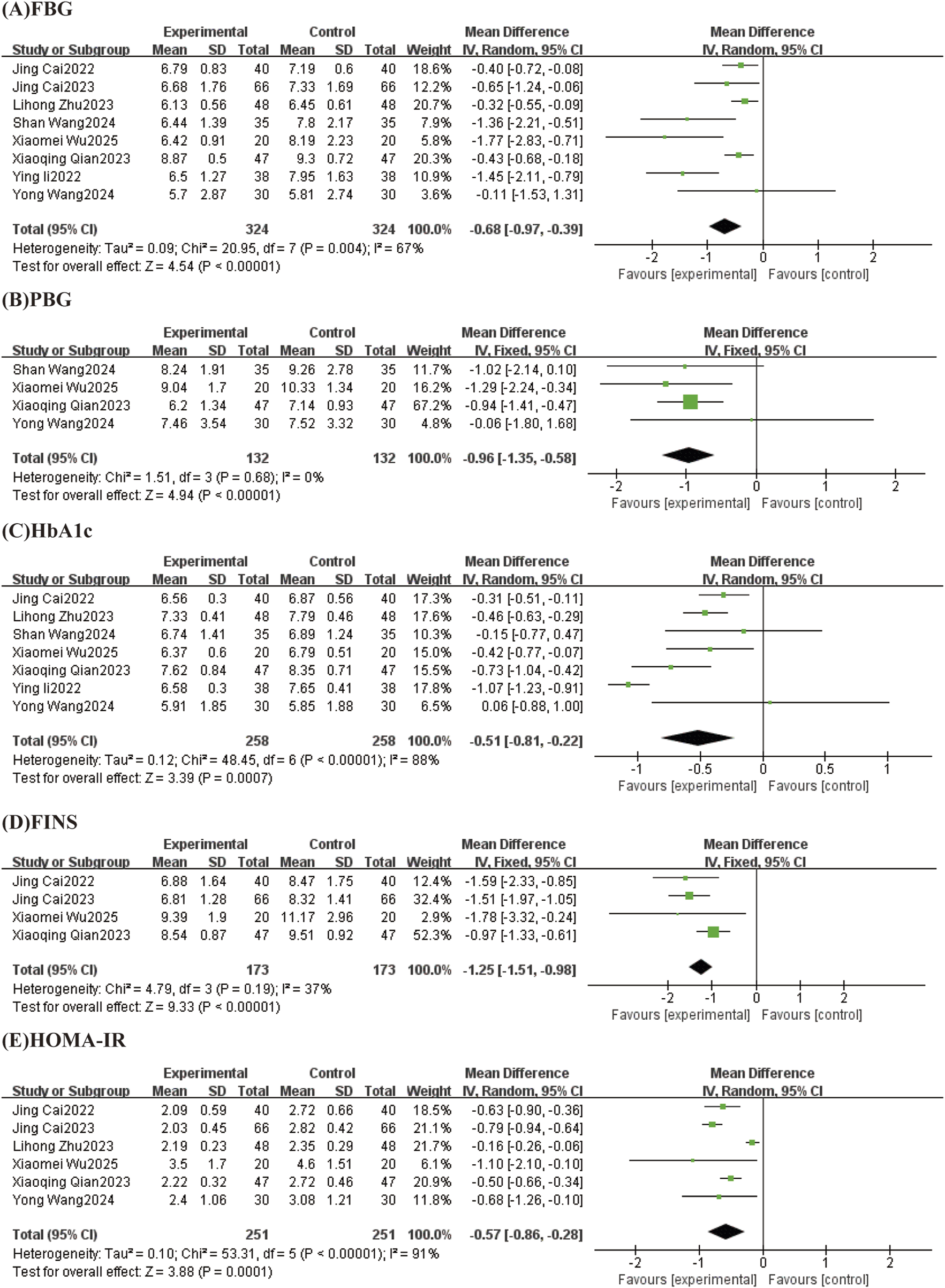 | HOMA-IR | Zhu, 2023 | Random-effects model | −0.57 [−0.86, −0.28] | Fixed-effects model | −0.66 [−0.76, −0.56] |