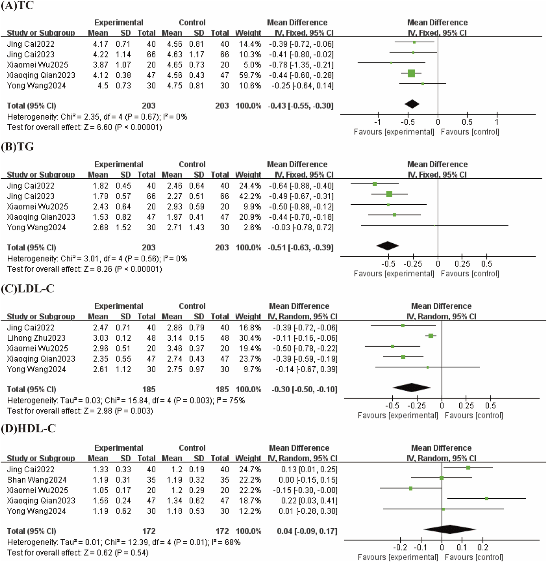| LDL | Zhu, 2023 | Random-effects model | −0.30 [−0.50, −0.10] | Fixed-effects model | −0.40 [−0.54, −0.26] |