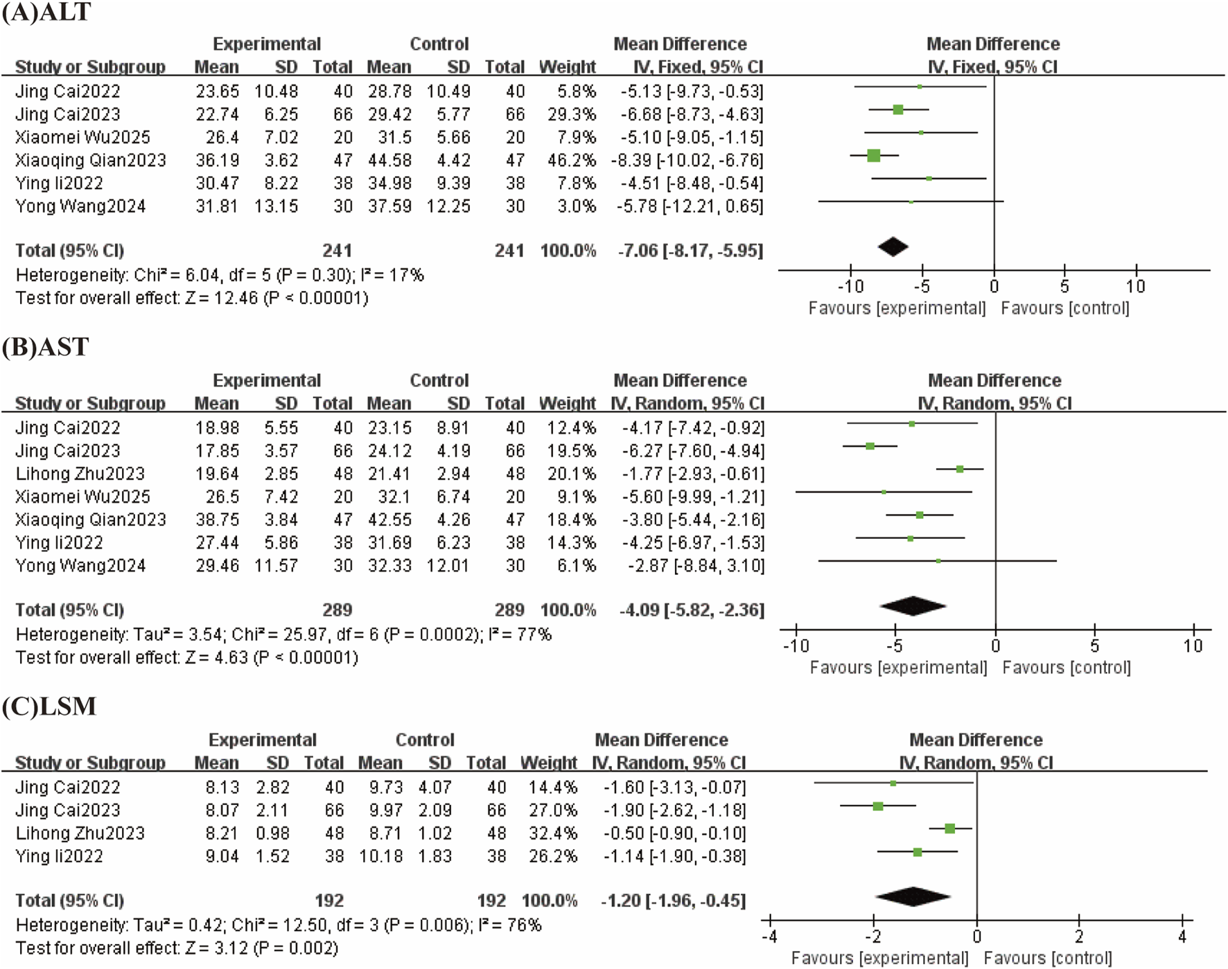 | AST | Zhu, 2023 | Random-effects model | −4.09 [−5.82, −2.36] | Fixed-effects model | −5.05 [−5.95, −4.16] |