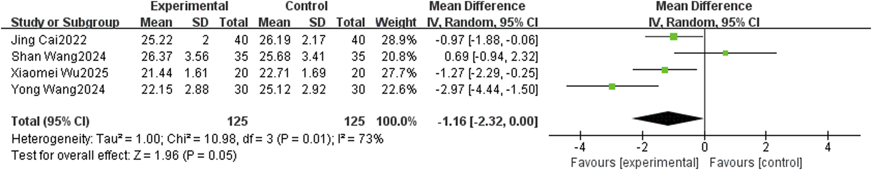 Random-effects model | −1.16 [−2.32, 0.00] | Fixed-effects model | −1.10 [−1.79, −0.42] |