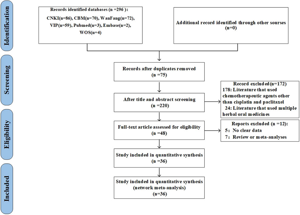 Exclusion criteria were as follows: 1. duplicated literature; 2. literature that used multiple herbal oral medicines; 3. literature that used chemotherapeutic agents other than cisplatin and paclitaxel; and 4. studies employing non-standardized or modified formulations (e.g., decoctions with variable ingredients).
