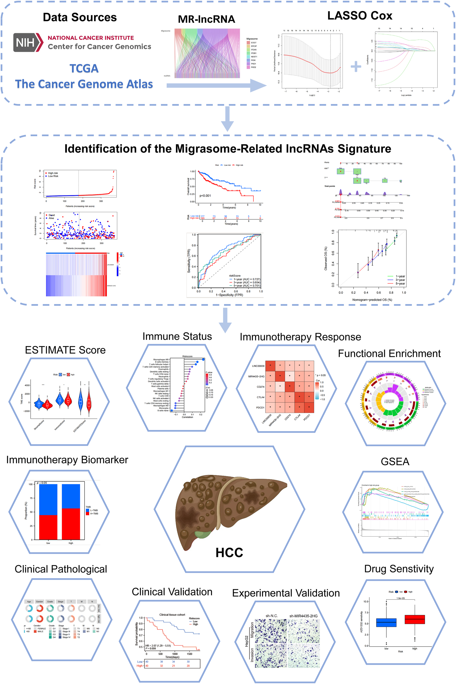 Collectively, our findings reveal that MRlncRNAs contribute to HCC progression and immunosuppressive remodeling of the tumor microenvironment. This work identifies novel biomarkers for prognosis and immunotherapy prediction and offers mechanistic insights into the migrasome–lncRNA–immunity axis, paving the way for personalized therapeutic strategies in HCC.