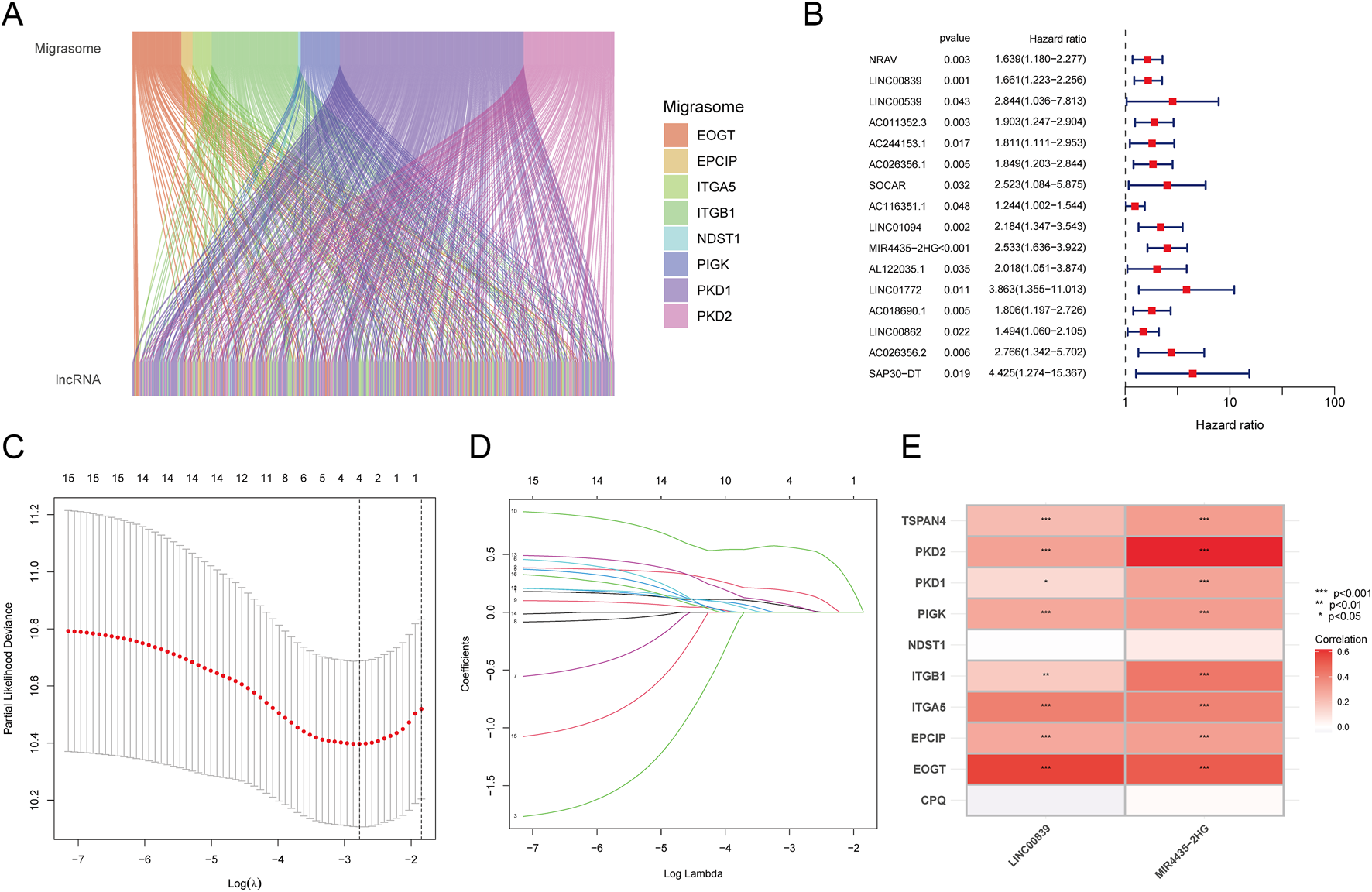 Figure 2. Identification of Prognostic MRlncRNAs and Construction of Prognostic Features. (A) Co-expression analysis of MRGs and lncRNAs; (B) Prognostic value of MRlncRNAs based on univariate Cox regression analysis (P < 0.05); (C) LASSO coefficient plot of prognostic MRlncRNAs; (D) Plot of the 10-fold cross-validation error rate; (E) Heatmap displaying the correlation between MRlncRNAs and MRGs.