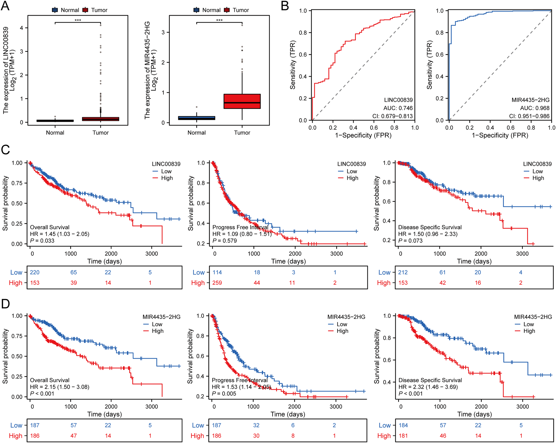 Figure 3. Expression and Prognostic Value Analysis of Prognostic MRlncRNAs in LIHC Patients. (A) Comparison of prognostic MRlncRNAs expression in liver tumors and normal tissues in TCGA databases; (B) ROC curves assessing the diagnostic potential of MRlncRNAs expression in LIHC; (C) Survival curves of OS, PFI, and DSS comparing high and low expression of LINC00839 in LIHC; (D) Survival curves of OS, PFI, and DSS comparing high and low expression of MIR4435-2HG in LIHC. *P < 0.05; **P < 0.01; ***P < 0.001.