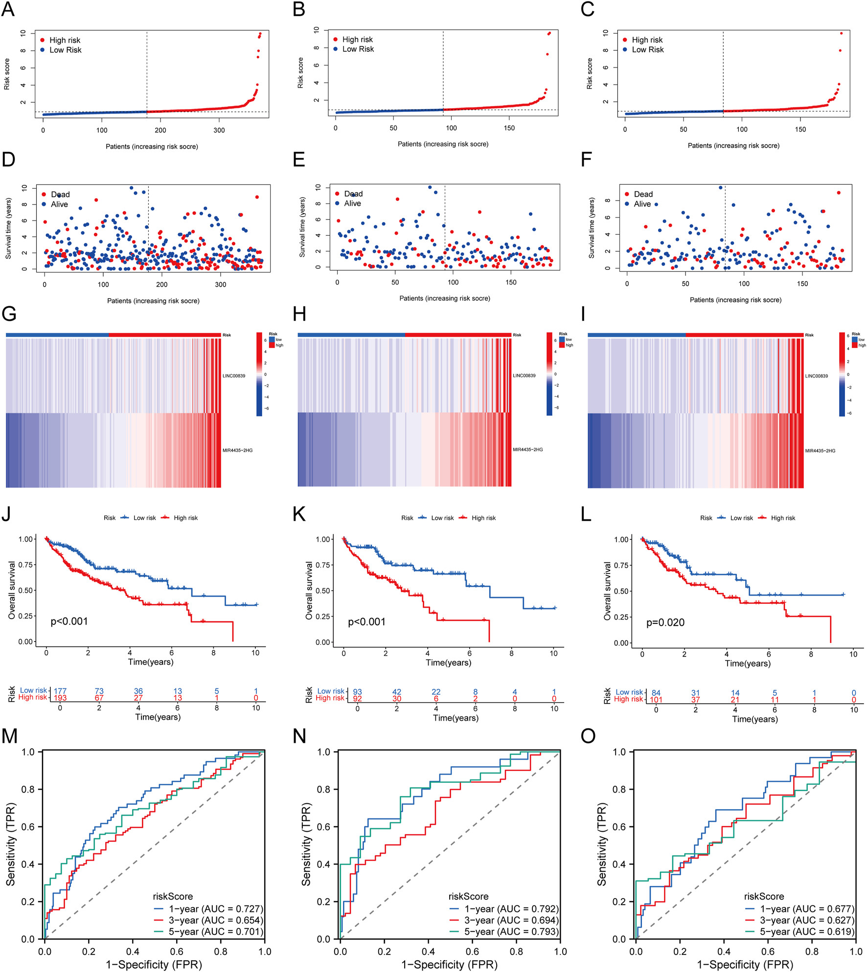 Figure 4. Establishment and Validation of Prognostic MRlncRNAs Features. (A–C) Distribution of risk scores for each patient in the TCGA-LIHC cohort, training cohort, and test cohort; (D–F) Distribution of overall survival status for each patient in the TCGA-LIHC cohort, training cohort, and test cohort; (G–I) Heatmap showing the expression of two prognostic MRlncRNAs in the TCGA-LIHC cohort, training cohort, and test cohort; (J–L) Kaplan-Meier survival curves for high-risk and low-risk groups comparing overall survival in the TCGA-LIHC cohort, training cohort, and test cohort; (M–O) Time-dependent ROC curves for 1-, 3-, and 5-year OS in the TCGA-LIHC cohort, training cohort, and test cohort.