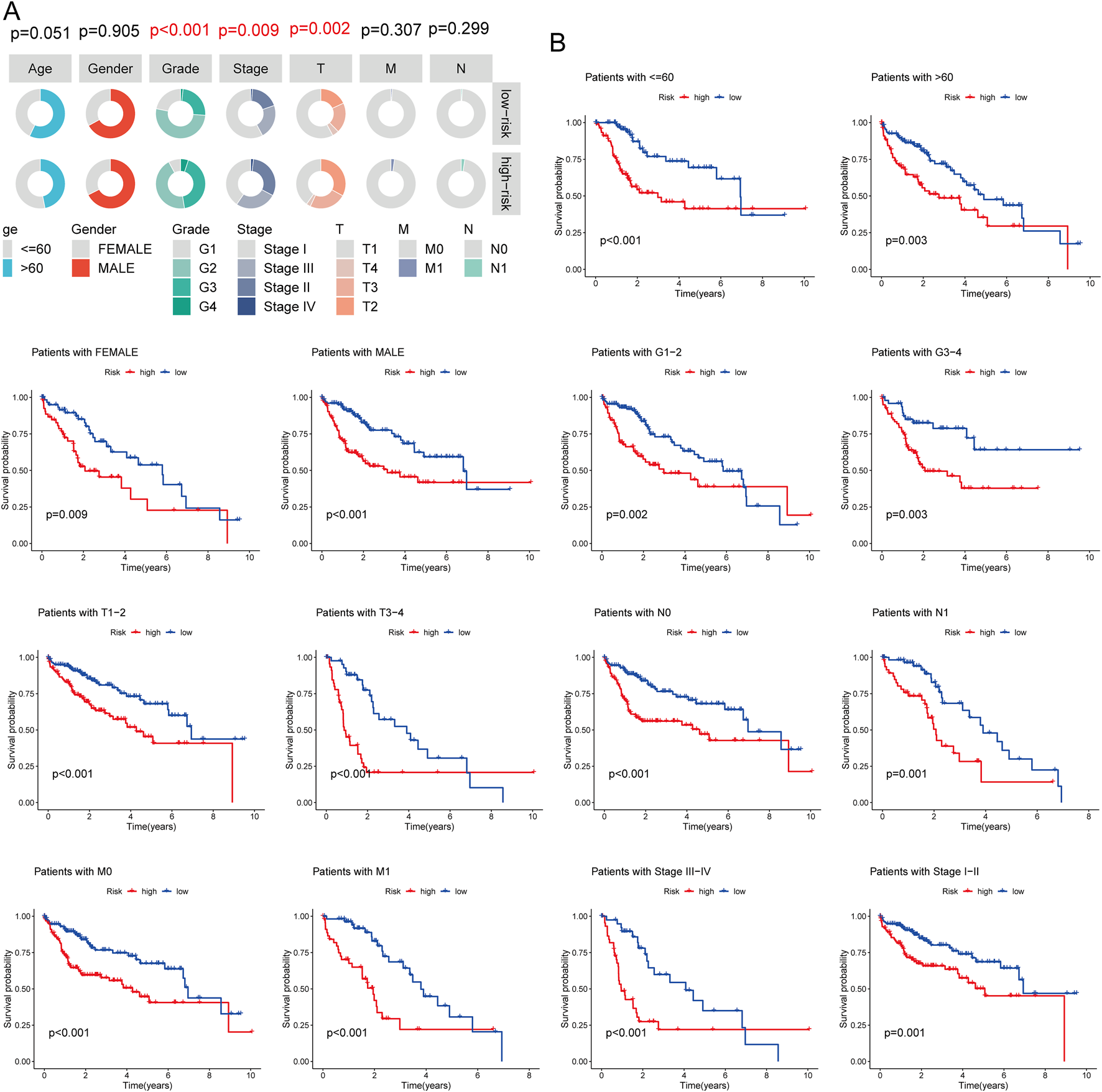 Figure 5. Association Between Risk Score and Clinicopathological Characteristics. (A) Circos plot showing the clinical factors between high and low-risk score groups; (B) Survival curve comparing high and low-risk score groups in different LIHC subgroups.