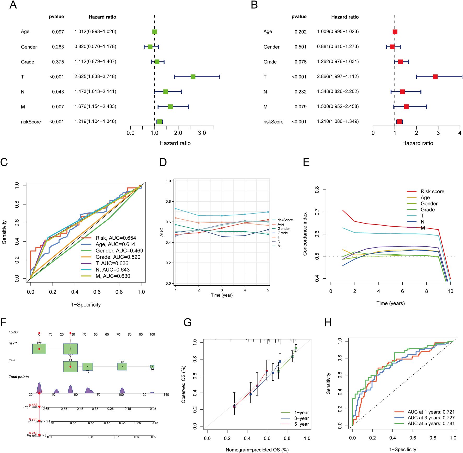 Figure 6. Construction and Validation of a Predictive Nomogram. (A,B) Univariate and multivariate Cox regression analysis of clinical variables in LIHC; (C) ROC curves for risk scores and various clinical pathological parameters (age, gender, Grade, T, N, M); (D) Time-dependent AUC curve showing the risk score’s performance in predicting OS; (E) Consistency index of the risk score and other clinical pathological variables; (F) Nomogram for predicting 1-, 3-, and 5-year OS of LIHC patients; (G) Calibration curve of the OS nomogram model in the discovery group, with the diagonal dotted line representing the ideal nomogram; (H) ROC curves for predicting 1-, 3-, and 5-year OS.