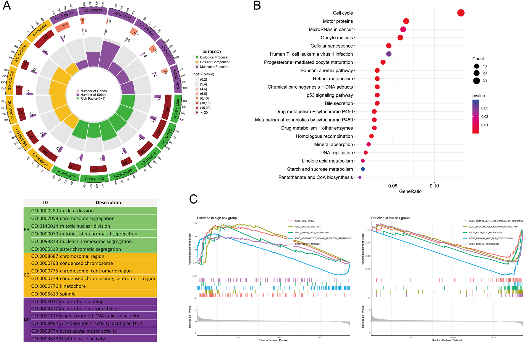 Figure 7. Functional Enrichment Analysis Between High and Low-Risk Groups. (A) GO enrichment results; (B) KEGG pathways; (C) GSEA analysis.