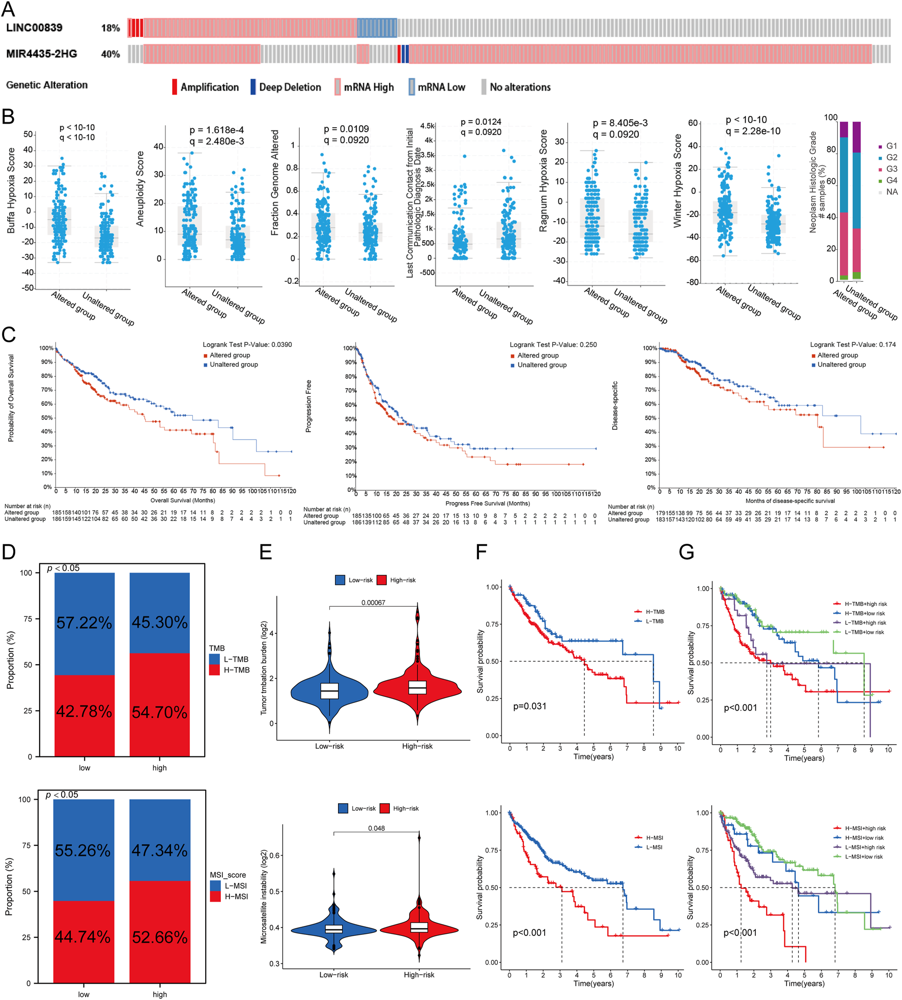 Figure 8. Genetic Alterations Associated with MRlncRNAs. (A) Oncoprint displaying somatic mutations in the LIHC tumor cohort; (B) Correlation between MRlncRNA alterations and various clinicopathological factors in LIHC, including Buffa Hypoxia Score, Winter Hypoxia Score, Aneuploidy Score, Ragnum Hypoxia Score, Fraction Genome Altered, Neoplasm Histologic Grade, and Last Communication Contact from Initial Pathologic Diagnosis Date; (C) Genetic alterations of MRlncRNAs in LIHC tissues correlated with shorter OS, PFS, and DFS in patients; (D) Distribution of TMB and MSI scores in high-expression and low-expression groups; (E) Differences in TMB and MSI between high and low-risk score groups in LIHC; (F) Kaplan-Meier survival curves for high and low TMB, MSI groups in LIHC; (G) Kaplan-Meier survival curves of four groups classified by risk score and TMB, MSI in LIHC.