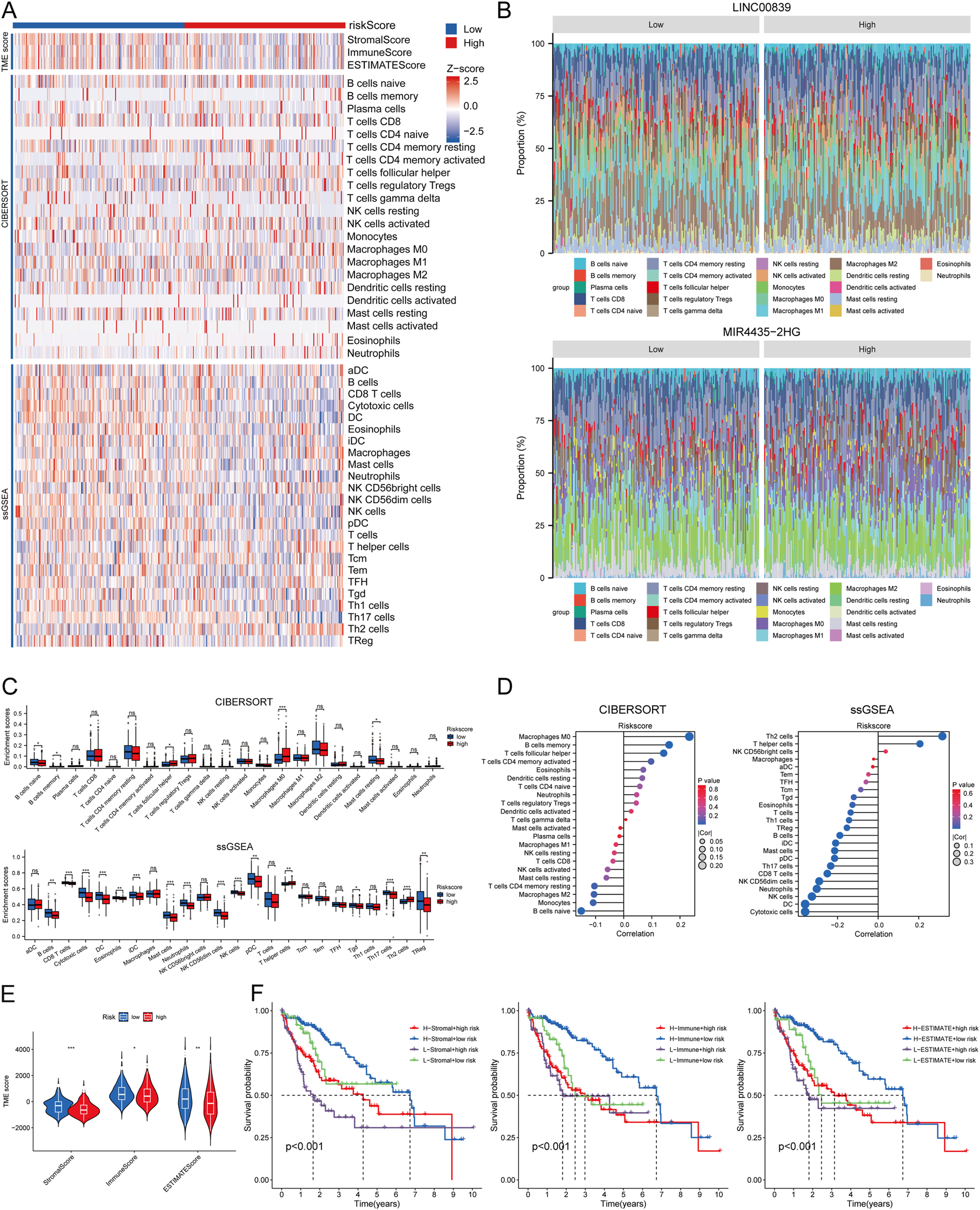Figure 9. Relationship Between Risk Score and Immune Infiltration in the Tumor Microenvironment. (A) Heatmap of immune cell scores between high and low-risk score groups using CIBERSORT, ssGSEA, and ESTIMATE algorithms; (B) Percent abundance of tumor-infiltrating immune cells between high and low expression groups of two prognostic MRlncRNAs, with different colors representing various immune cell types; (C) Comparison of immune scores between high and low-risk score groups using CIBERSORT and ssGSEA; (D) Correlation analysis between risk score and immune infiltration using CIBERSORT and ssGSEA; (E) Differences in ESTIMATE between high and low-risk score groups; (F) Kaplan-Meier curves of four groups classified by risk score and three ESTIMATE scores in LIHC.