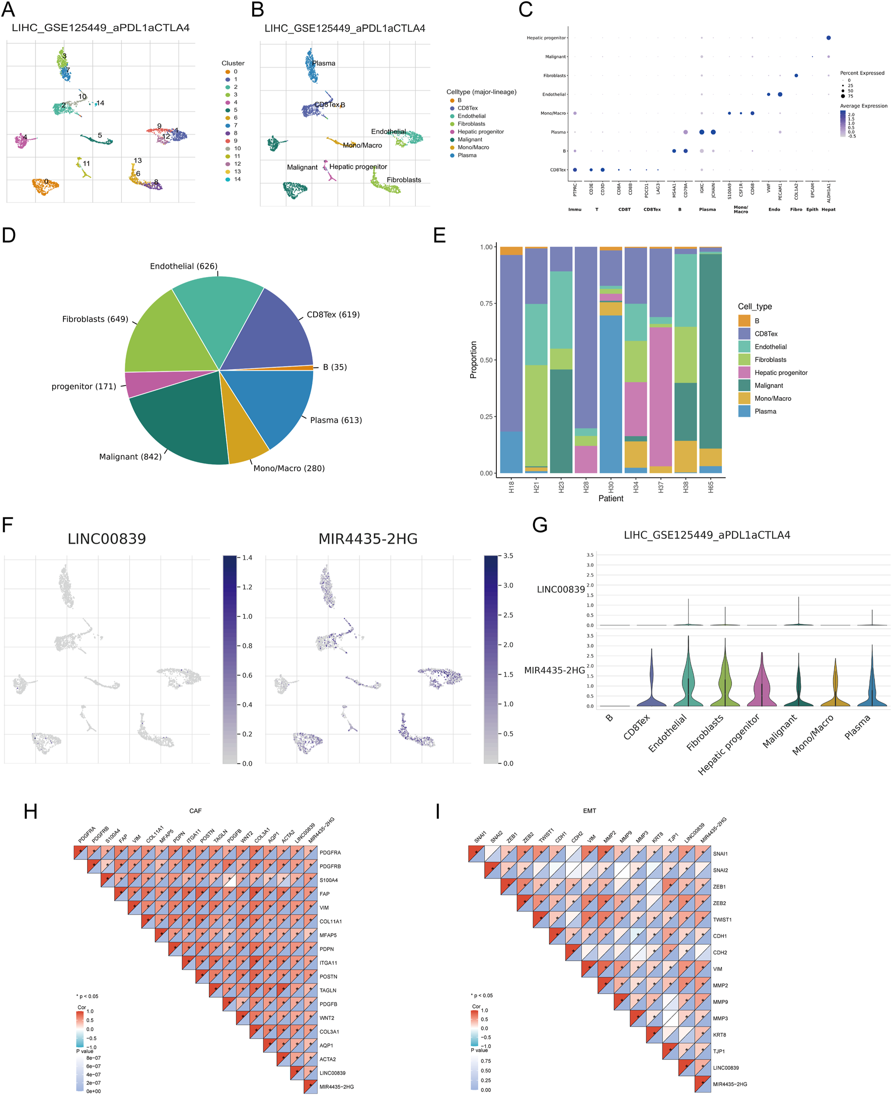 Figure 10. Expression of MRlncRNAs in Different Immune Cell Types in LIHC. (A) Clustering of cell types from scRNA-seq data; (B) Annotation of different immune cell types in LIHC tissues (LIHC_GSE125449); (C) Expression levels of marker genes in each cell cluster; (D) Pie chart showing the percentage of each cell type; (E) Percentage of each cell subtype in different patients; (F) Expression distribution of LINC00839, MIR4435-2HG in various cell types using single-cell resolution from the LIHC_GSE125449 dataset; (G) Violin plots showing the expression of LINC00839 and MIR4435-2HG in LIHC cells; (H,I) Correlation between LINC00839, MIR4435-2HG and CAFs or EMT-related markers.