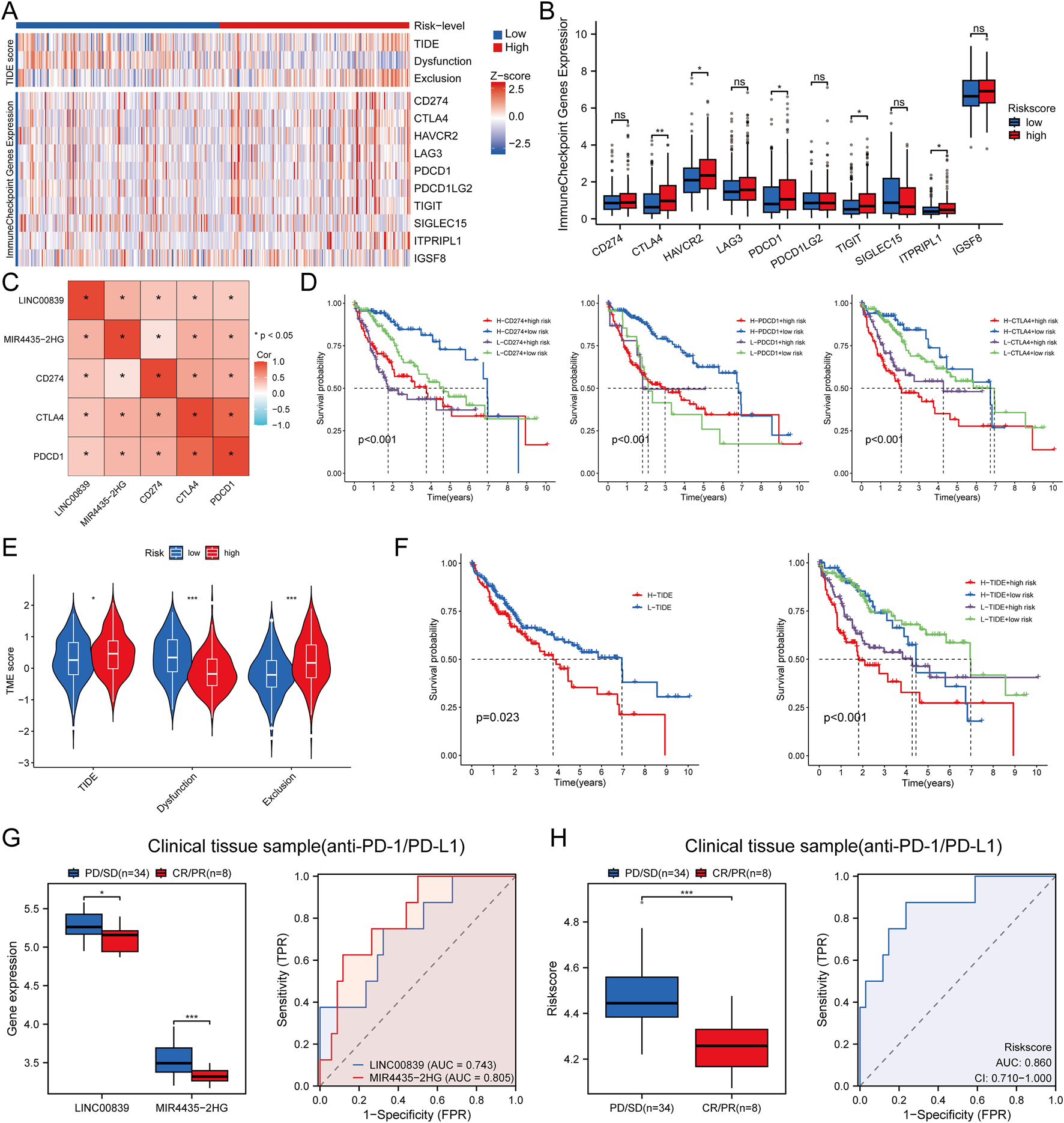 Figure 11. Immune Response Analysis. (A) Heatmap of immune checkpoint gene expression and TIDE scores between high and low-risk score groups, with different colors representing expression trends across different samples; (B) Expression distributions of eight immune checkpoint-associated genes between high and low-risk score groups in LIHC; (C) Correlation between risk score and clinical immune checkpoint-related genes in LIHC; (D) Kaplan-Meier survival curves for four groups classified by risk score and CD274, PDCD1, CTLA expression; (E) TIDE score evaluation of risk scores in response to immunotherapy in LIHC; (F) Kaplan-Meier survival plots of overall survival for high and low TIDE scores; (G,H) Differences in MRlncRNAs expression and risk score between patients with SD/PD and CR/PR in clinical tissue samples; ROC analysis of MRlncRNAs expression and risk score for predicting ICI responsiveness in clinical tissue samples (NR: non-responders; R: responders to immunotherapy).