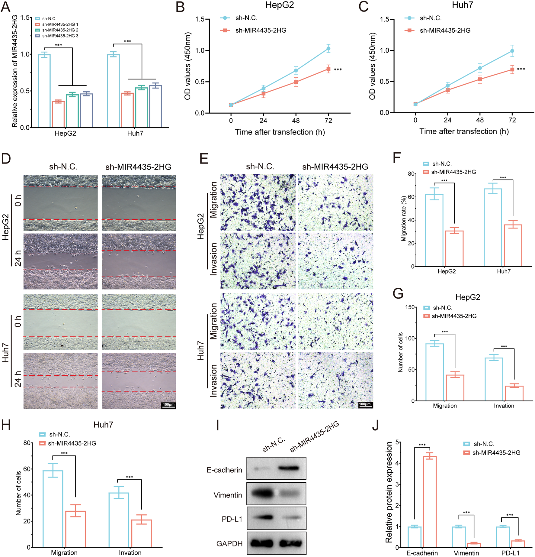 Figure 13. MIR4435-2HG knockdown suppresses proliferation, migration, invasion, EMT, and PD-L1 expression in HCC cells. (A) qRT-PCR showing knockdown efficiency of MIR4435-2HG in HepG2 and Huh7 cells using three shRNAs. (B,C) CCK-8 assays showing that MIR4435-2HG knockdown significantly inhibited cell proliferation in HepG2 (B) and Huh7 (C) cells at 24, 48, and 72 h. (D) Wound healing assay revealed impaired migration at 24 h in sh-MIR4435-2HG cells. (E) Transwell assays showed decreased migration and invasion. (F–H) Quantification of migration rates and cell numbers in HepG2 and Huh7. (I) Western blot showed increased E-cadherin and decreased Vimentin and PD-L1 upon MIR4435-2HG knockdown. GAPDH served as internal control. (J) Densitometric analysis of protein expression. Data are presented as mean ± SD; ***P < 0.001.
