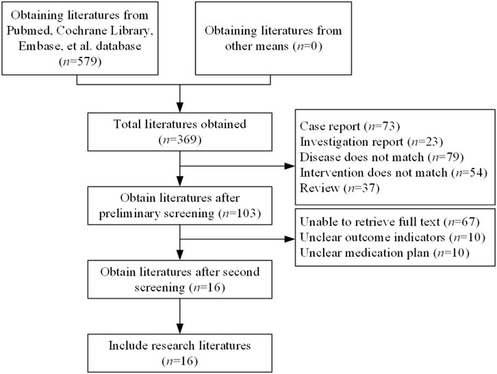 A total of 579 articles were retrieved. After duplicates were removed, 369 studies remained. Following a preliminary review of the articles and abstracts, 266 studies were excluded, including case reports, reviews, studies with inappropriate interventions, those focused on diseases not aligned with the research objectives, and other studies that did not meet the inclusion criteria. This left 103 articles for further screening. After the full texts were downloaded and reviewed, 87 articles were discarded due to unclear outcome measures, ambiguous therapy protocols, or inaccessible data. Ultimately, 16 studies (Sabatine et al., 2017; O'Donoghue et al., 2022; Nicholls et al., 2022; Broch et al., 2024; Schwartz et al., 2021; Schwartz et al., 2018; Schwartz et al., 2020; Nam et al., 2019; Ray et al., 2022; Raal et al., 2024; Ray et al., 2024; Qi et al., 2023; Chai et al., 2023; Wang et al., 2024; Jiang et al., 2024; Zhang et al., 2024) were included in this research (Figure 1).