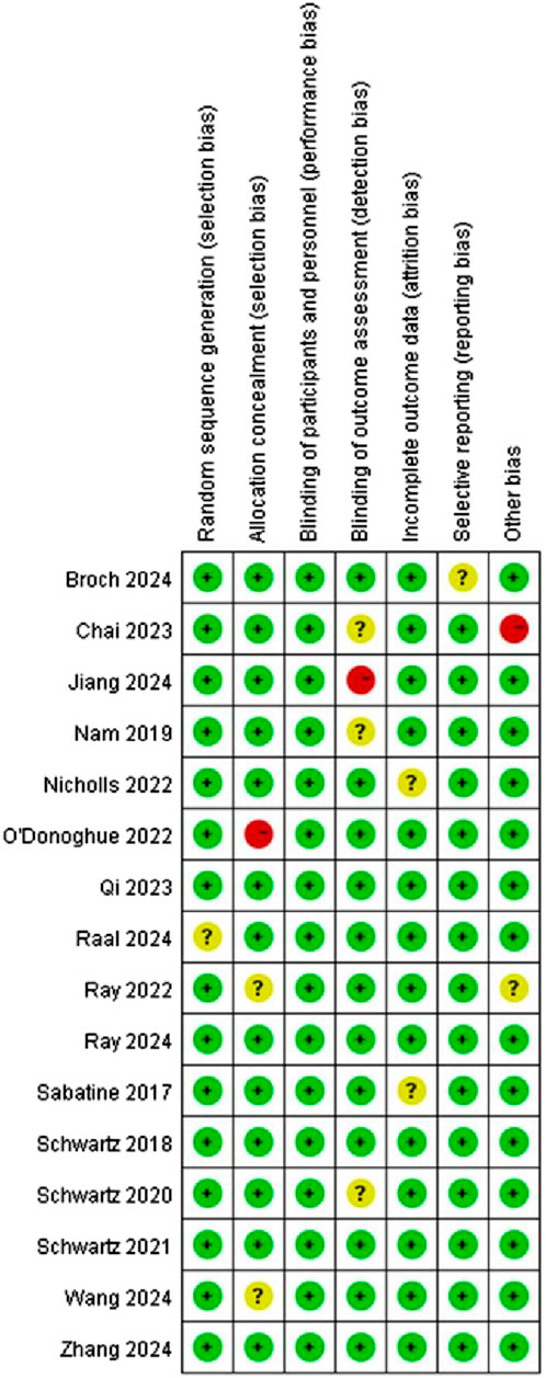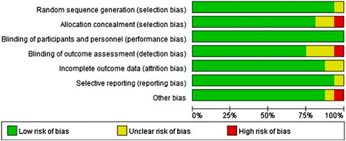 Cochrane Risk of Bias Tool (Martimbianco et al., 2023) assessed literature quality and potential bias. The criteria for assessment covered various aspects such as random sequence generation and allocation concealment (selection bias), participants and personnel blinding (performance bias), outcome assessment blinding (detection bias), incomplete outcome data handling (attrition bias), selective reporting (reporting bias). Each of these potential biases was classified into “Low risk”, “Unclear risk”, or “High risk”.