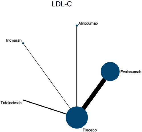 Nine studies included in this analysis investigated impact of DTRs on LDL-C, involving 40,378 patients across five intervention groups: Evolocumab, Alirocumab, Inclisiran, Tafolecimab, and placebo (Figure 4). The NMA of LDL-C levels revealed that the ranking of treatments in terms of SUCRA values for LDL-C reduction, from highest to lowest, was as follows: Evolocumab (67.2%), Alirocumab (66.6%), Tafolecimab (65.7%), Inclisiran (43.2%), and placebo (7.2%) (Figure 5).