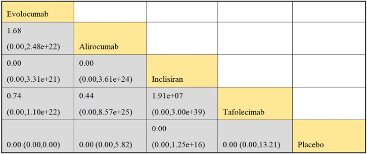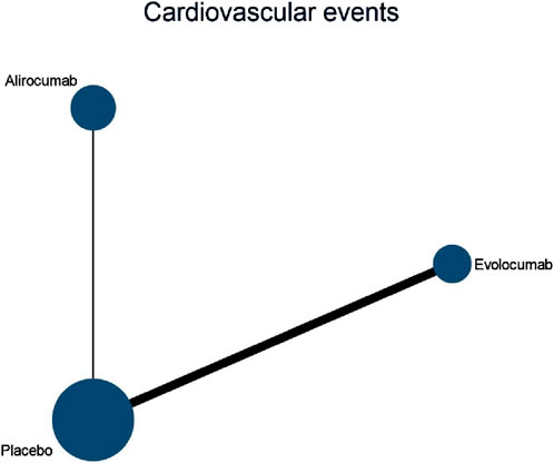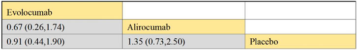 Six studies included in this analysis examined effect of DTRs on CVEs, involving 75,056 patients across three intervention groups: Evolocumab, Alirocumab, and placebo (Figure 6). The NMA of CVEs demonstrated that the ranking of treatments in terms of SUCRA values for reducing the incidence of CVEs, from highest to lowest, was as follows: Evolocumab (69.5%), placebo (61.6%), and Alirocumab (18.9%) (Figure 7).