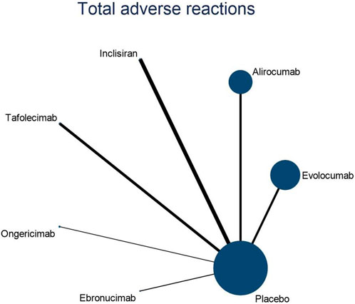 Nine studies included in this analysis evaluated impact of DTRs on injection site reactions, involving 48,356 patients across seven interventions: Evolocumab, Alirocumab, Inclisiran, Tafolecimab, Ongericimab, Ebronucimab, and placebo. The NMA of injection site reactions revealed that the ranking of treatments in terms of SUCRA values for reducing the incidence of injection site reactions, from highest to lowest, was as follows: placebo (89.8%), Evolocumab (68.0%), Tafolecimab (65.2%), Alirocumab (45.7%), Ongericimab (42.1%), Inclisiran (36.9%), and Ebronucimab (2.3%).