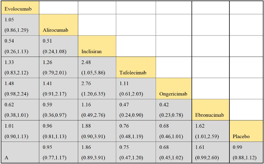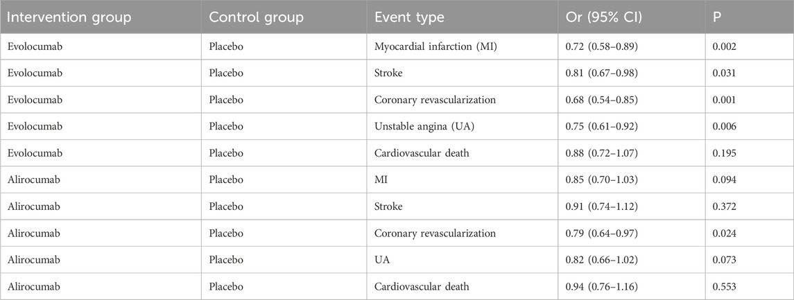 In this study, CVEs included the following specific types: myocardial Infarction (MI): non-fatal or fatal MI as defined by the WHO criteria or the study’s definition; stroke: including ischemic or hemorrhagic stroke, which must be confirmed by imaging; coronary revascularization: including percutaneous coronary intervention (PCI) or coronary artery bypass grafting (CABG); unstable angina (UA): must meet the Braunwald classification criteria; cardiovascular death: death clearly attributed to cardiovascular causes. Evolocumab significantly reduced the risk of MI (−28%), stroke (−19%), coronary revascularization (−32%), and UA (−25%), consistent with the results of the FOURIER trial (Sabatine et al., 2017). Cardiovascular death did not reach statistical significance, which may be related to the study design’s focus on non-fatal events. Alirocumab showed a significant protective effect on coronary revascularization (−21%), but had a weaker impact on MI and stroke, in line with trends observed in the ODYSSEY OUTCOMES trial (Schwartz et al., 2021; Schwartz et al., 2018; Schwartz et al., 2020). The effect sizes for MI and coronary revascularization were higher, likely due to the direct delay in atherosclerosis progression from LDL-C reduction. The stroke effect was smaller, potentially due to the slower action of PCSK9 inhibitors on plaque stability (Table 3).