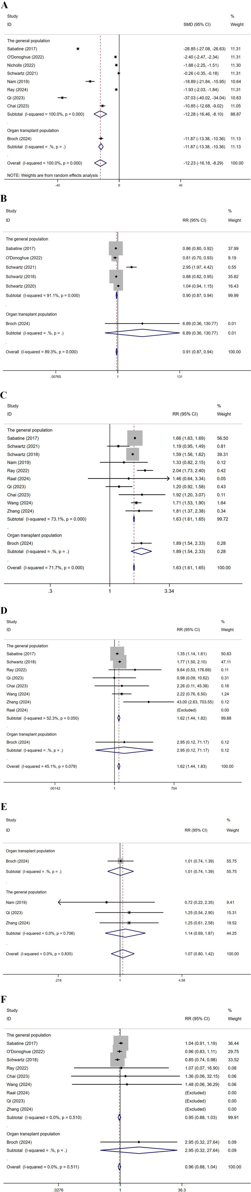 Figure 10. Subgroup analysis by population (A): represents LDL-C levels, (B) CVEs, (C) total AEs, (D) injection site reactions, (E) infections, (F) represents ACM. (Kidney transplant n = 78, heart transplant n = 127, liver transplant n = 802) Note: Heart transplant recipients had a baseline ASCVD risk score ≥10%, while liver transplant recipients were predominantly at low risk (<7.5%).