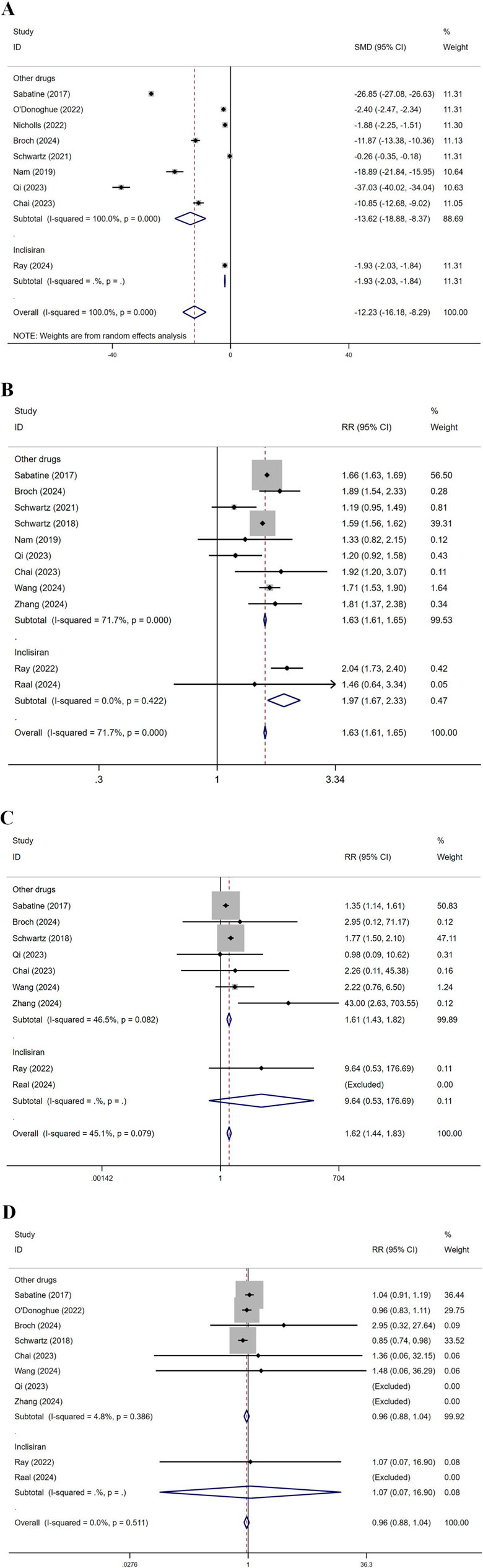 Subgroup analysis by drug was conducted, dividing the groups into Inclisiran and other drugs (Figure 11). For LDL-C levels, the SMD for other drugs was −13.62, while for Inclisiran, it was −1.93, with an overall SMD of −12.23, indicating significant effects for both. Regarding total AEs, in the other drugs group, multiple studies reported RR values between 1.19 and 2.04, with an overall RR of 1.63. In the Inclisiran group, two studies reported RR values of 2.04 and 1.46, with an overall RR of 1.97, resulting in an overall RR of 1.63, indicating a significant effect. For injection site reactions, in the other drugs group, multiple studies showed RR values between 0.98 and 43.00, with an overall RR of 1.61. In the Inclisiran group, the study by Ray (2022) reported an RR of 9.64, with an overall RR of 1.62, indicating a significant effect. Regarding ACM, in the other drugs group, multiple studies showed RR values between 0.85 and 2.95, with an overall RR of 0.96. In the Inclisiran group, Ray (2022) reported an RR of 1.07, with an overall RR of 0.96, indicating no significant effect.