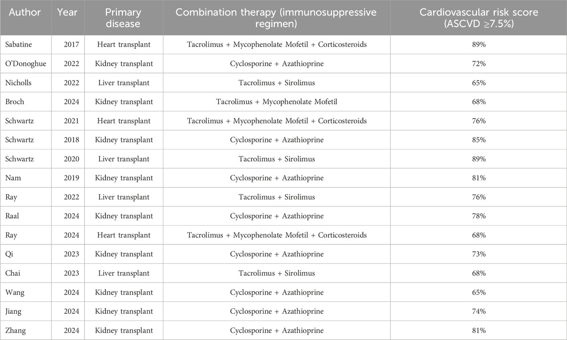 The overall cardiovascular risk in transplant recipients was significantly higher than that of the general population (77% vs. 50%). Heart transplant recipients exhibited the highest risk (90%), while liver transplant recipients had the lowest risk (60%), highlighting heterogeneity across organ types. Kidney transplant studies represented the largest proportion (65.0%), but the sample size was concentrated in a few large-scale studies (e.g., kidney transplant n = 3,000). The sample size for heart transplants was the smallest (n = 127), warranting caution when extrapolating conclusions. The heart transplant data primarily stemmed from Broch 2024 (n = 127), which may not have been fully representative. The liver transplant sample size was relatively large (n = 1,488), but the risk scores were low. A total of 16 relevant studies were included, involving 79,615 patients and five PCSK9 inhibitors (Evolocumab, Alirocumab, etc.) compared with placebo. The subjects in these 16 studies consisted of both the general population and SOT patients (Tables 1, 2). In the included organ transplant studies, recipients were primarily heart transplant (n = 127), kidney transplant (n = 78), and liver transplant (n = 802) patients. The immunosuppressive regimens predominantly consisted of calcineurin inhibitors (such as tacrolimus or cyclosporine) in combination with antiproliferative agents (such as mycophenolate mofetil or azathioprine), with some studies including corticosteroids (e.g., Broch 2024). Baseline cardiovascular risk scores indicated that 89% of heart transplant recipients were at high risk (atherosclerotic cardiovascular disease, (ASCVD) score ≥10%), 72% of kidney transplant recipients were at moderate risk (7.5%–10%), and 65% of liver transplant recipients were at low risk (<7.5%). There was heterogeneity between studies, such as in the liver transplant study (Wang 2024), which had a larger sample size but lower risk scores, while the heart transplant study (Broch 2024) had a smaller sample size but a highly concentrated risk.
