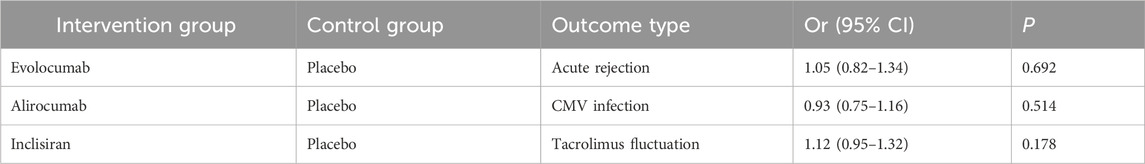 In Table 4, the subgroup analysis showed that PCSK9 inhibitors did not significantly increase the risk of acute rejection in transplant recipients (OR 1.05, 95% CI 0.82-1.34), but it should be noted that the sample size was small (n = 127). Furthermore, there was no significant difference in infection risk (e.g., CMV infection) between the intervention and control groups (OR 0.93, 95% CI 0.75-1.16).