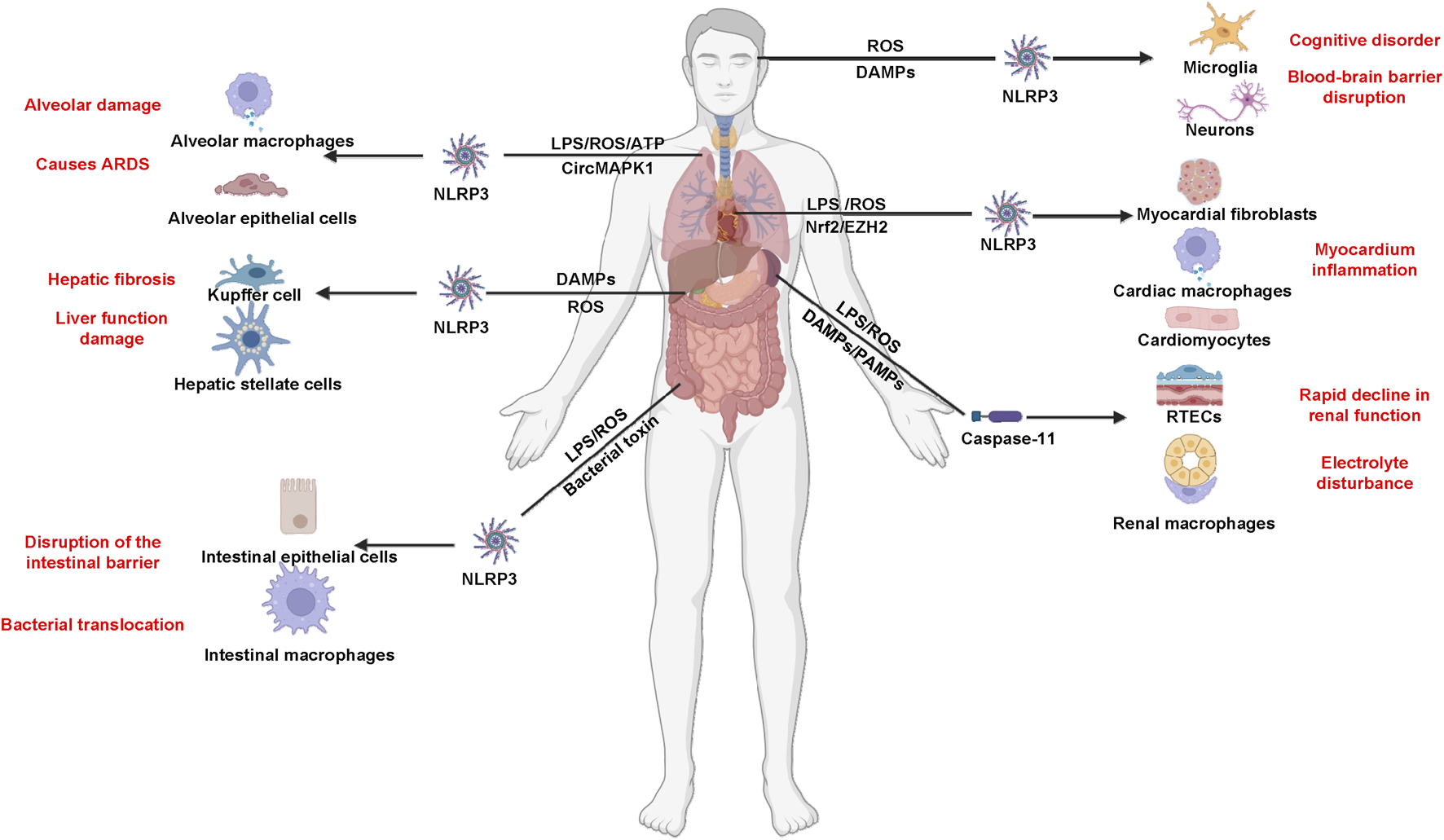 Pyroptosis is an inflammatory form of cell death characterized by pore formation in cell membranes, leading to cell swelling, rupture, and the release of large amounts of inflammatory mediators such as IL-1β and IL-18 (Charles et al., 2021; Yi et al., 2021). Central to this process is the inflammasome, which plays a pivotal role in mediating interactions between the immune system and cellular components (Esteban et al., 2023). As a key element of the innate immune system, the inflammasome is vital for defending the body against pathogens and external stressors by activating caspase-1 and stimulating the release of inflammatory cytokines like IL-1β and IL-18 (Yi et al., 2021). The inflammasome also plays a crucial role in the body’s response to pathogenic threats. Its activation is essential for the innate immune response upon pathogen infection (Nijin et al., 2023). Caspase-1, a critical component of the inflammasome, serves a protective function against various pathogenic invasions (Hila et al., 2020). Additionally, recent studies have highlighted the role of Caspase-11 in the noncanonical inflammasome pathway, which is involved in pyroptosis and the release of specific inflammatory molecules (Kevin et al., 2020; Xu et al., 2023). This underscores that the inflammasome is integral not only to intracellular signaling and regulation but also to the cellular response to external stimuli. This review explores the involvement of the inflammasome and pyroptosis in sepsis and its associated organ dysfunction, with a particular emphasis on the impact on specific organs such as the heart, lungs, liver, kidney and brain, trying to provide new perspectives on potential treatments for sepsis and related organ complications in a clinical context.