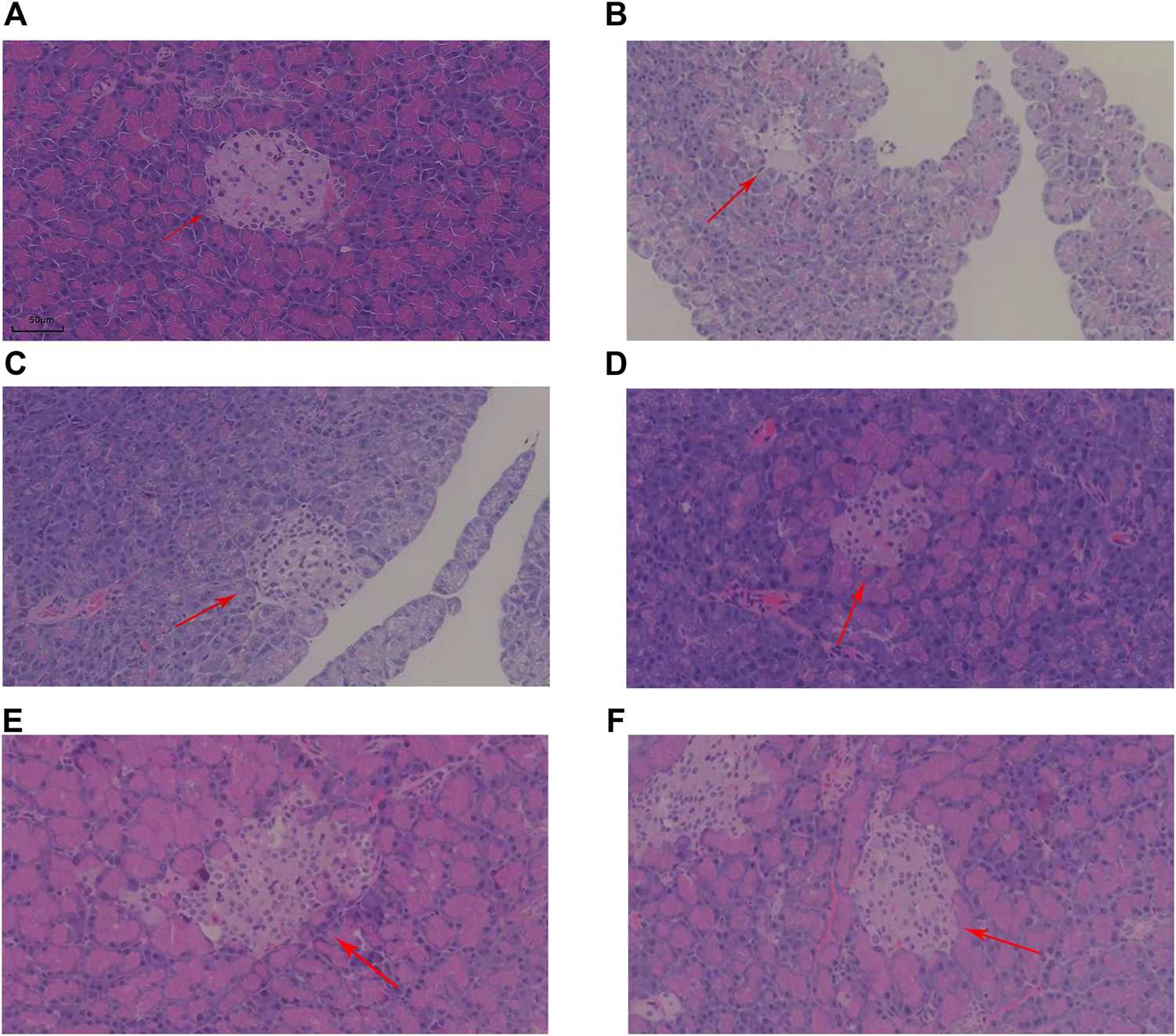 Representative hematoxylin and eosin (H&E)-stained sections of pancreatic tissue in each group. The HE section of rat pancreas in NC group (A), the HE section of rat pancreas in MOD group (B), the HE section of rat pancreas in RG group (C), the HE section of rat pancreas in KR-EA-L group (D), the HE section of rat pancreas in KR-EA-M group (E) and the HE section of rat pancreas in KR-EA-H group (F). The arrows point to islet cells.