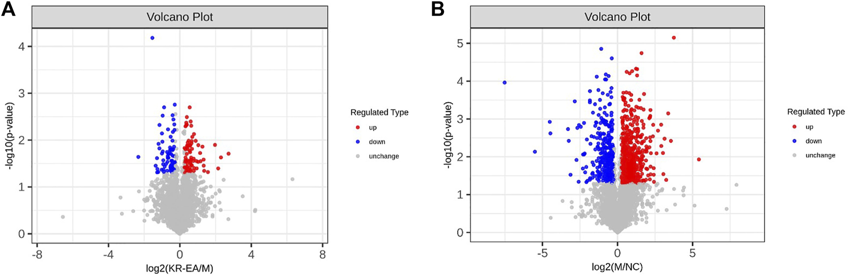 Differentially expressed proteins (DEPs) profiles based on TMT proteomics analysis. Volcano plots of DEPs between the MOD group and the positive KR-EA-H (A) and between the NC group and the MOD group (B). x-coordinate is the logarithmic value of the relative quantitative values of the proteins after Log2 transformation, and the y-coordinate is the P-value after -log10 transformation. Red dots indicate significantly upregulated proteins and green dots indicate significantly downregulated proteins.