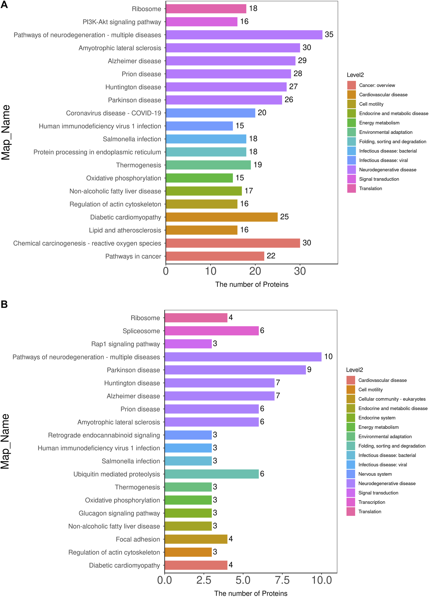 KEGG pathway annotation and attribution histogram of differentially expressed proteins. KEGG pathway annotation of differentially expressed proteins between the MOD group and the NC group (A) and between the KR-EA-H group and the MOD group (B). X-axis represents the number of proteins involved in each pathway, and the y-axis lists the specific KEGG pathway names. Different colors in the legend represent different pathway categories. Red indicates cancer, orange indicates nervous system disease, yellow indicates energy metabolism, green indicates digestive system disease, cyan indicates infectious disease, blue indicates signal transduction, purple indicates immune disease, pink indicates endocrine and metabolic disease, and brown indicates environmental adaptation.