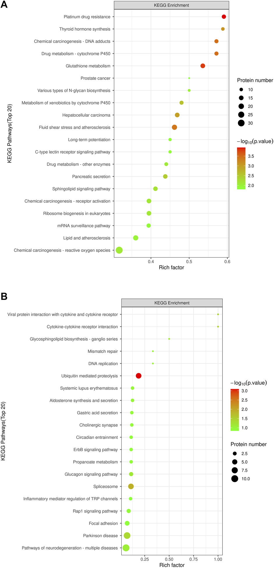 KEGG pathway enrichment bubble chart of differentially expressed proteins. The KEGG pathway enrichment plot shows the top 20 enriched pathways of differentially expressed proteins between the MOD group and the NC group (A) and between the KR-EA-H group and the MOD group (B). X-axis Rich factor represents the ratio of the number of differentially expressed proteins observed in a specific pathway to the total number of proteins in that pathway, and y-axis lists the specific KEGG pathway names. The color of the bubbles represents the number of proteins, with darker colors indicating a higher number of proteins. The size of the bubbles represents −log10 (P-value), i.e., enrichment significance, with larger bubbles indicating higher significance.