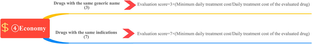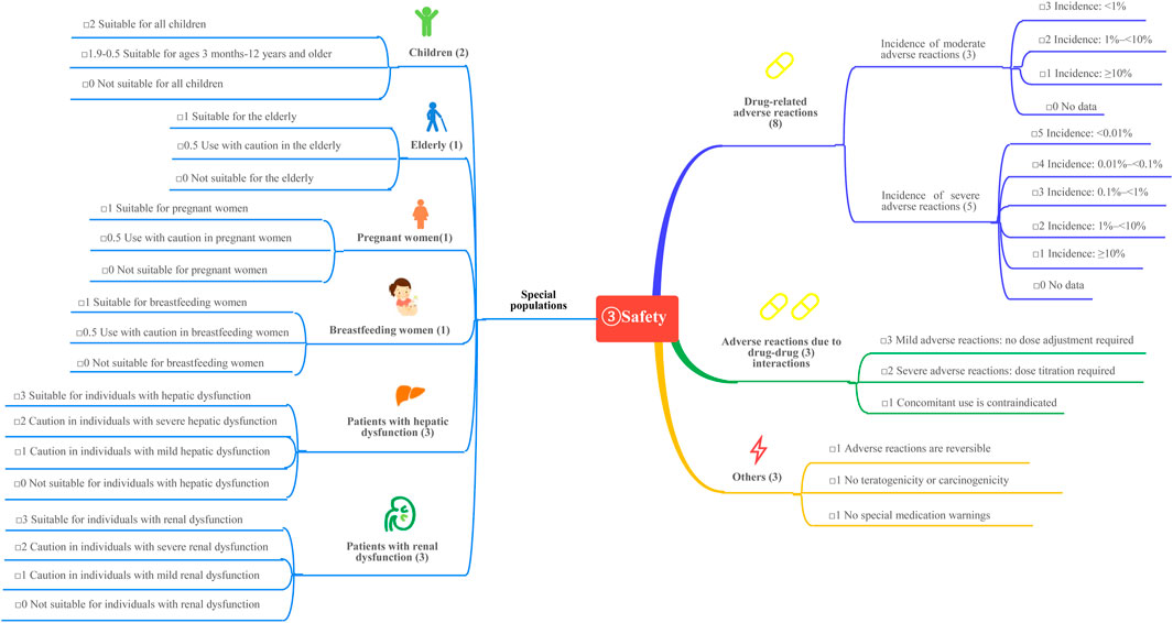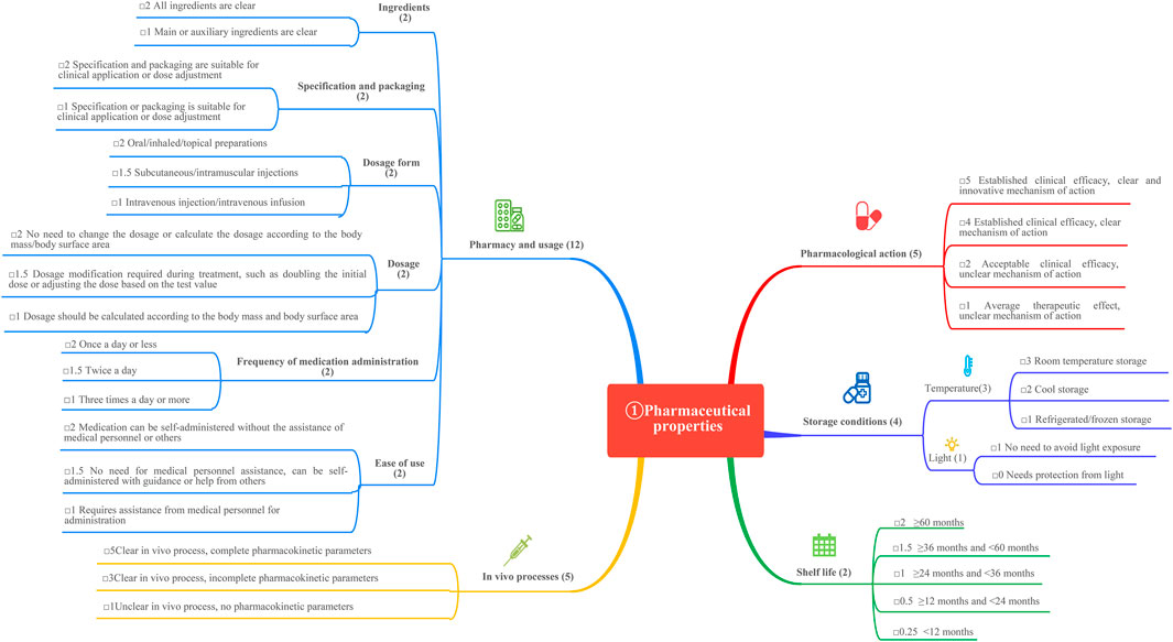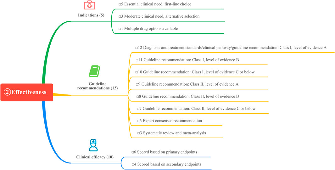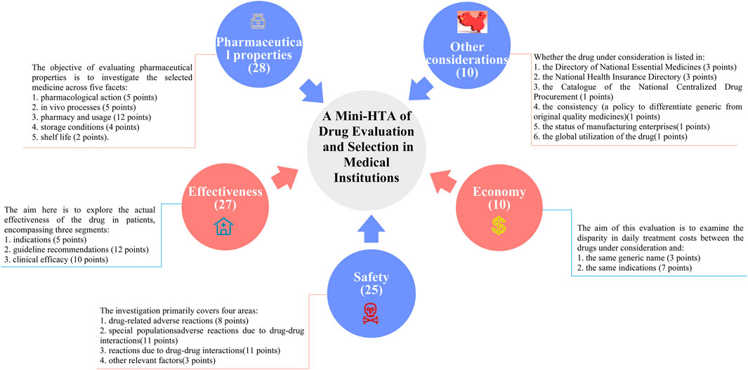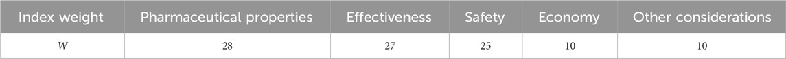 This study is based on the Quantitative Record Form for Drug Evaluation and Selection in Medical Institutions (Figure 1), outlined in A Quick Guideline for Drug Evaluation and Selection in Chinese Medical Institutions (Second Edition; hereafter referred to as the Guideline). This form is based on evidence-based research findings (Martelli et al., 2016; Mannucci et al., 2020) and integrates the Mini-HTA assessment framework with the System of Objectified Judgement Analysis method, which has been adapted to align with China’s unique national context (Marsico et al., 2020). The evaluation system is structured around five core dimensions: pharmaceutical properties, effectiveness, safety, economy, and other considerations. Each dimension is assigned a specific weight to reflect its relative importance in the overall assessment: pharmaceutical properties (28 points, Figure 2), effectiveness (27 points, Figure 3), safety (25 points, Figure 4), economy (10 points, Figure 5), and other considerations (10 points, Figure 6). The total score for the evaluation indices is 100 points, ensuring a comprehensive and balanced assessment framework.