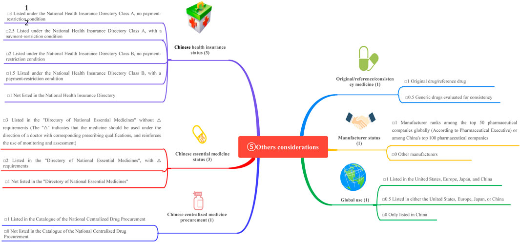 This category evaluates policy attributes (e.g., inclusion in Chinese health insurance and essential drug lists), originator attributes (e.g., reference drug or consistency evaluation), and market attributes (e.g., global usage and manufacturer status). These factors reflect the accessibility of drugs post-marketing. Table 7 presents the scores.