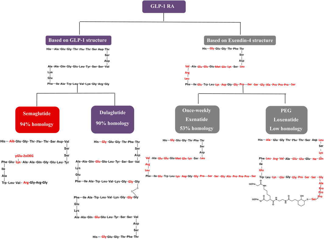 The GLP-1 RAs exert antihyperglycemic effects by enhancing glucose-dependent insulin secretion (Zhao et al., 2020). Weekly GLP-1 RAs formulations are categorized into two groups based on their structural modifications. The first group involves localized modifications to the molecular structure of GLP-1, resulting in high homology with native GLP-1 and a low incidence of allergic reactions during clinical use (Manandhar and Ahn, 2015). The second group comprises structural modifications of exenatide (exendin-4), a GLP-1 analogue with lower homology to GLP-1, which is associated with a higher incidence of allergic reactions in clinical practice. Focusing on structural modifications, semaglutide achieves 94% homology with native GLP-1 by substituting three amino acids at positions 8, 26, and 34. This homology surpasses dulaglutide and significantly exceeds exenatide-based formulations and PEG loxenatide (Lund et al., 2014; Lau et al., 2015). This structural similarity to native GLP-1, particularly in semaglutide and dulaglutide, contributes to enhanced receptor binding affinity and prolonged resistance to enzymatic degradation, supporting longer half-life and once-weekly dosing. In contrast, exenatide and PEG loxenatide, with lower homology, display different pharmacokinetic profiles that may influence efficacy and clinical use. Figure 8 highlights these molecular differences, linking structure to pharmacological behavior and clinical performance.