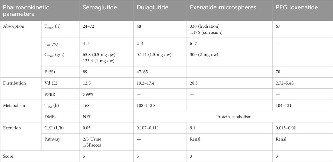 Studies have shown a direct correlation between half-life duration and fluctuations in drug concentration during the same dosing interval (Kapitza et al., 2015). With a 7-day half-life, semaglutide outperforms other weekly GLP-1 RAs in maintaining stable drug concentrations (Pradhan et al., 2020). Its pharmacokinetic parameters are precise and well-characterized, with a superior elimination half-life and stability, warranting a score of 5. In comparison, dulaglutide, exenatide microspheres, and PEG loxenatide exhibit clear but incomplete pharmacokinetic data, earning a score of 3 each, as shown in Table 2.
