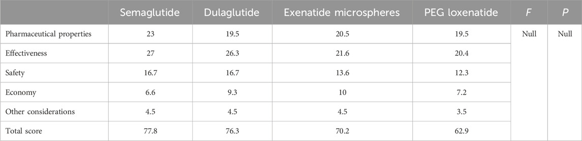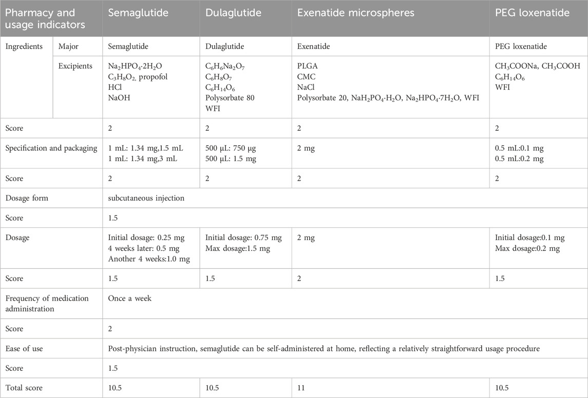The final scores for pharmaceutical characteristics are as follows: semaglutide (23), dulaglutide (19.5), exenatide microspheres (20.5), and PEG loxenatide (19.5). Semaglutide’s superior pharmacological and pharmacokinetic properties earn it the highest score in this category.