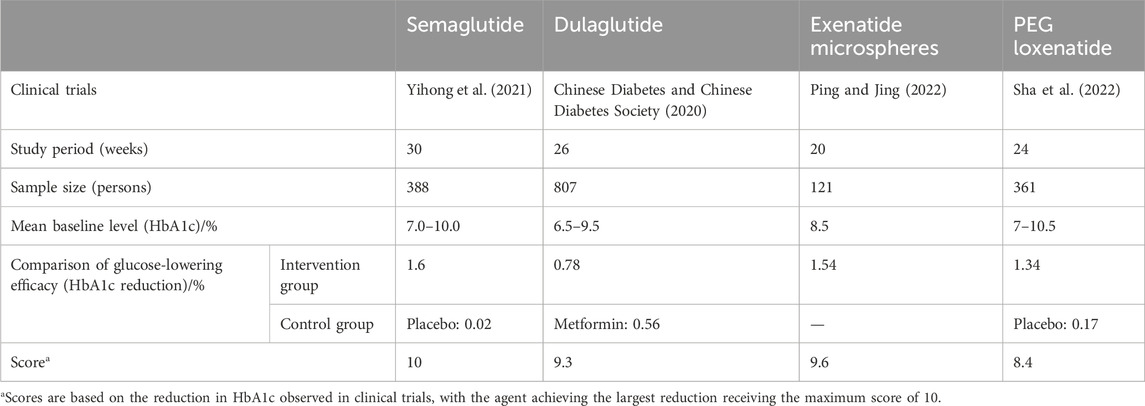 The 2024 ADA guidelines recommend GLP-1 RAs and SGLT-2is, with or without metformin depending on glycemic control needs, as initial therapeutic agents for patients with T2DM and comorbid ASCVD, heart failure, or chronic kidney disease (American Diabetes Association, 2024). Similarly, the Chinese Guidelines for the Prevention and Control of Type 2 Diabetes Mellitus (2020) advocate for GLP-1 RAs or SGLT-2is in T2DM patients with ASCVD or cardiovascular risk factors, regardless of glycosylated hemoglobin (HbA1c) levels, provided no contraindications exist (Soci and ety, 2021). Additionally, the Chinese Expert Consensus on the Diagnosis and Treatment of Cardiovascular Disease in Patients with Diabetes Mellitus (2021) recommends metformin as the initial treatment for T2DM patients with cardiovascular disease, unless contraindicated. If metformin is contraindicated or not tolerated, GLP-1 RAs or SGLT-2is with established cardiovascular and renal benefits are advised as first-line agents (Yihong et al., 2021). Given their cardiovascular benefits, semaglutide and dulaglutide are the preferred agents in treatment guidelines, each receiving a score of 12. In contrast, exenatide and loxenatide, which lack cardiovascular benefits, are assigned a score of 9.