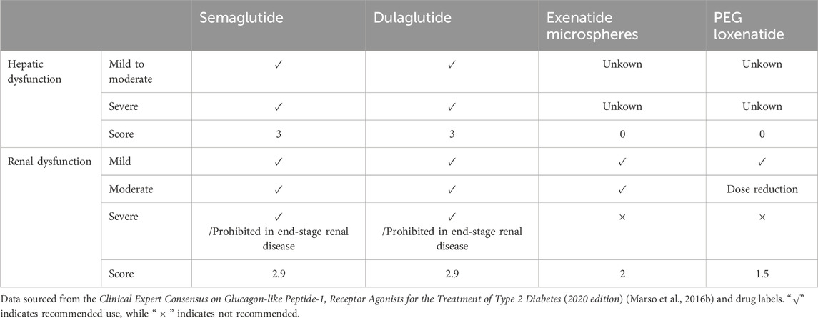 Patients with abnormal liver and kidney function: In patients with hepatic and renal dysfunction, dose adjustments and corresponding scores for GLP-1 RAs are summarized in Table 5.