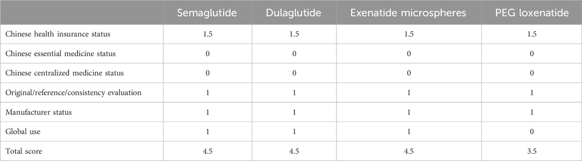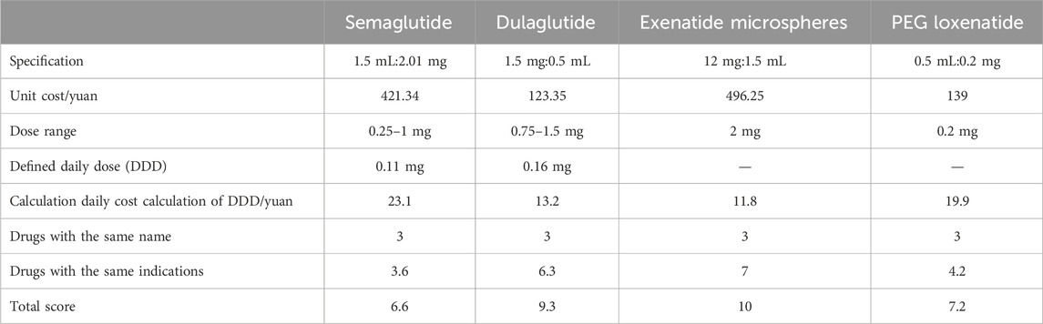This study introduced several methodological innovations. First, in the effectiveness evaluation, the clinical efficacy of each drug was quantitatively assessed using clinical trial data while incorporating the guideline-recommended level for each drug. Semaglutide, which exhibited the highest glucose-lowering efficacy (Hu et al., 2023), was assigned the top score of 10. The scores for other drugs were calculated using the formula: Drug score = (Glucose-lowering efficacy of semaglutide)/(Glucose-lowering efficacy of the evaluated drug) × 10. This approach enabled precise scoring of effectiveness based on glucose-lowering efficacy. Second, for the economic evaluation, the study accounted for variations in glucose-lowering efficacy and patient tolerance across products, which influence individual maintenance dosages. Economic evaluation was conducted using the daily dosage assessment of the Defined Daily Dose (DDD) value (Bindel and Seifert, 2025), thereby minimizing the impact of individual differences on the economic assessment of the drugs.