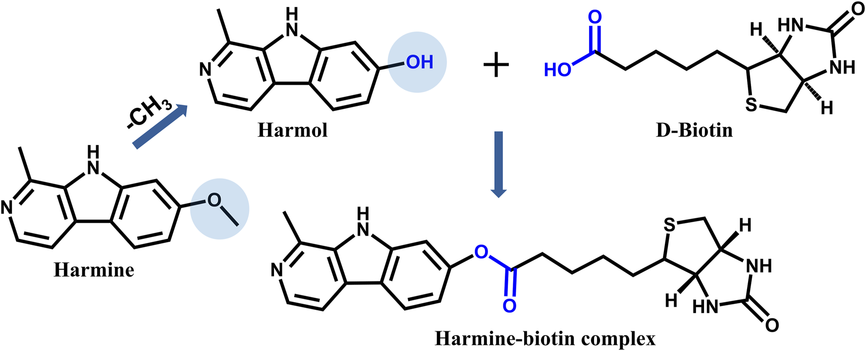 The schematic representation of the chemical synthesis of harmine-biotin complex.
