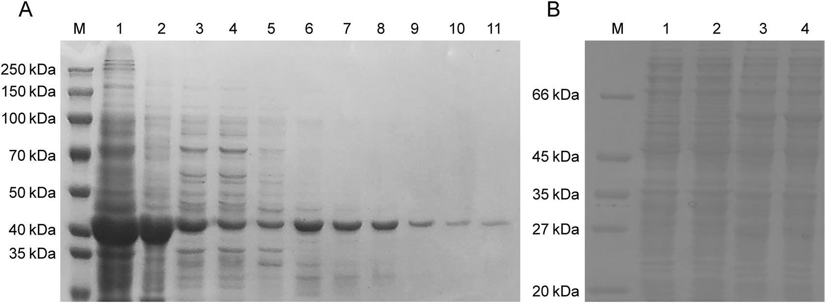 Figure 2. Analysis of soluble APMAP-X1 protein in E. coli BL21 (DE3) and P. pastoris GS115 by SDS-PAGE. (A) Purification of recombinant APMAP-X1 in E. coli BL21 (DE3). Channel 1: the inclusion body, channel 2: the precipitate after the dissolution of inclusion body, channel 3: the inclusion body after dialysis renaturation, channel 4: the supernatant after adsorption on the Ni affinity column, channel 5: 50 mM imidazole eluent, channels 6, 7: 100 mM imidazole eluent, channels 8, 9: 250 mM imidazole eluent, channels 10, 11: 500 mM imidazole eluent. (B) Purification of recombinant APMAP-X1 in P. pastoris GS115. Channel 1: soluble protein in GS115/pGAPZB colony, Channel 2, 3, 4: soluble protein in the supernatant of GS115/pGAPZB-APMAP-X1 after 2, 4 and 6 days of induction.